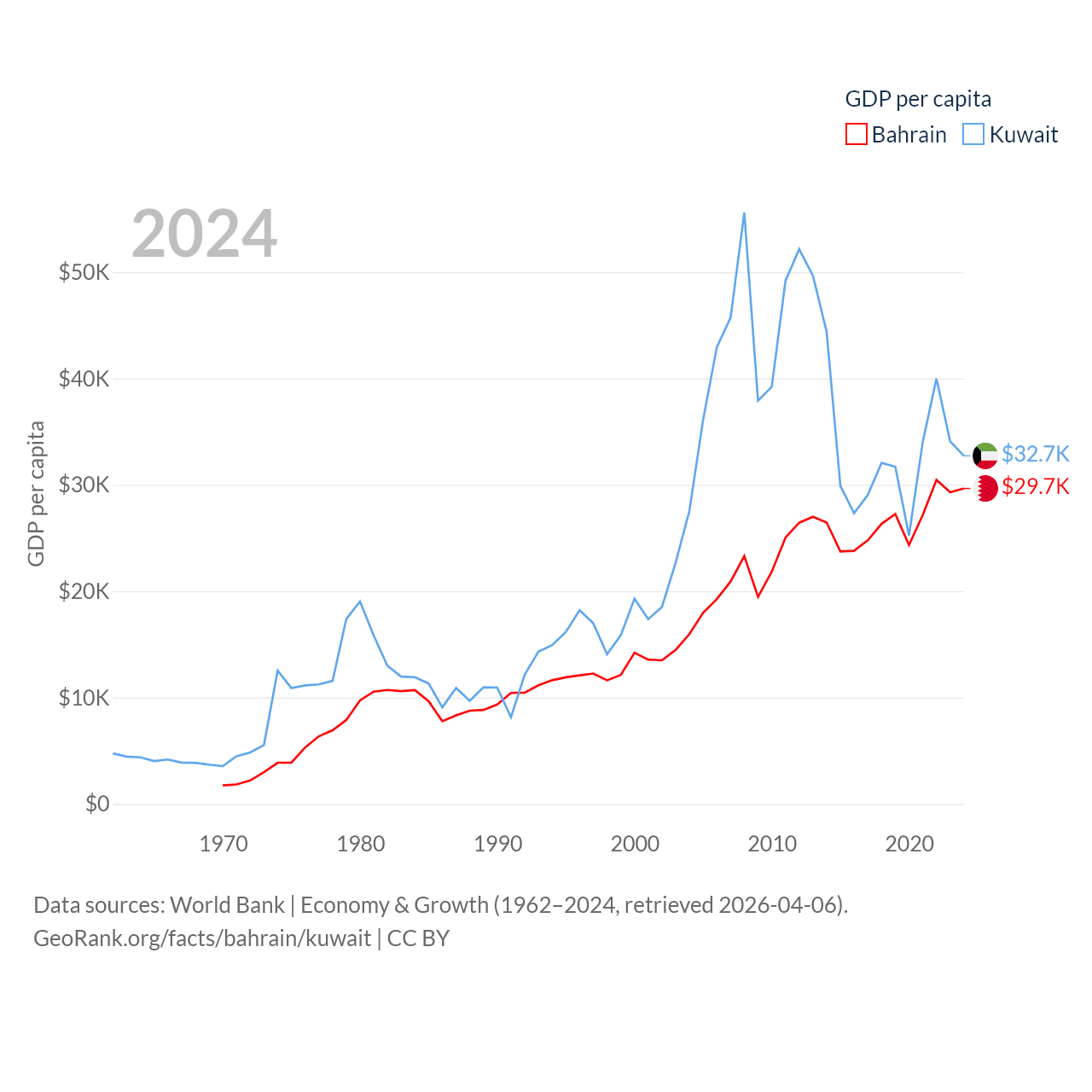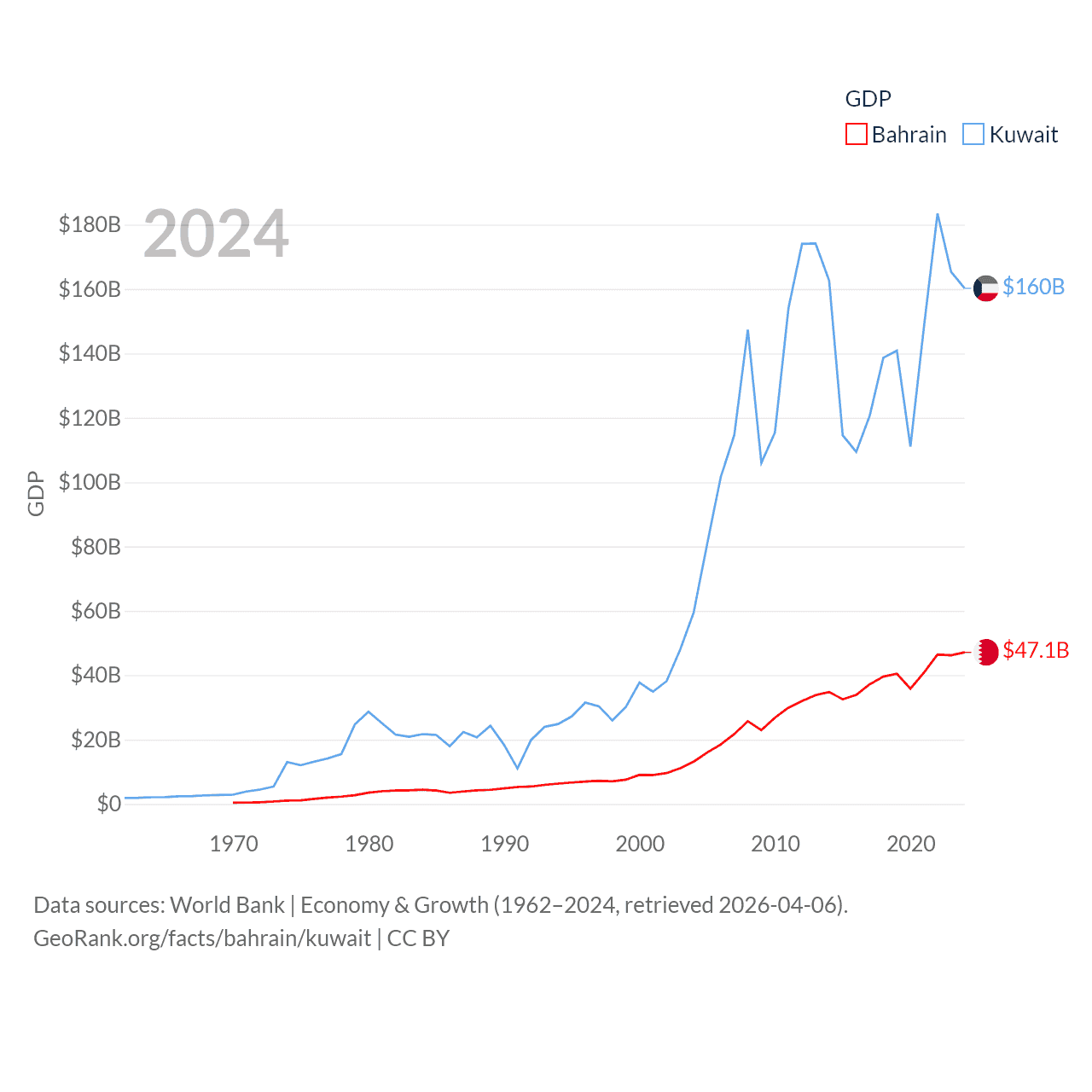 By GDP, Bahrain ranks 96/197 ($47.1B) and Kuwait ranks 59/197 ($160B). By GDP per capita, Bahrain ranks 42/197 ($29,654), while Kuwait ranks 37/197 ($32,718).