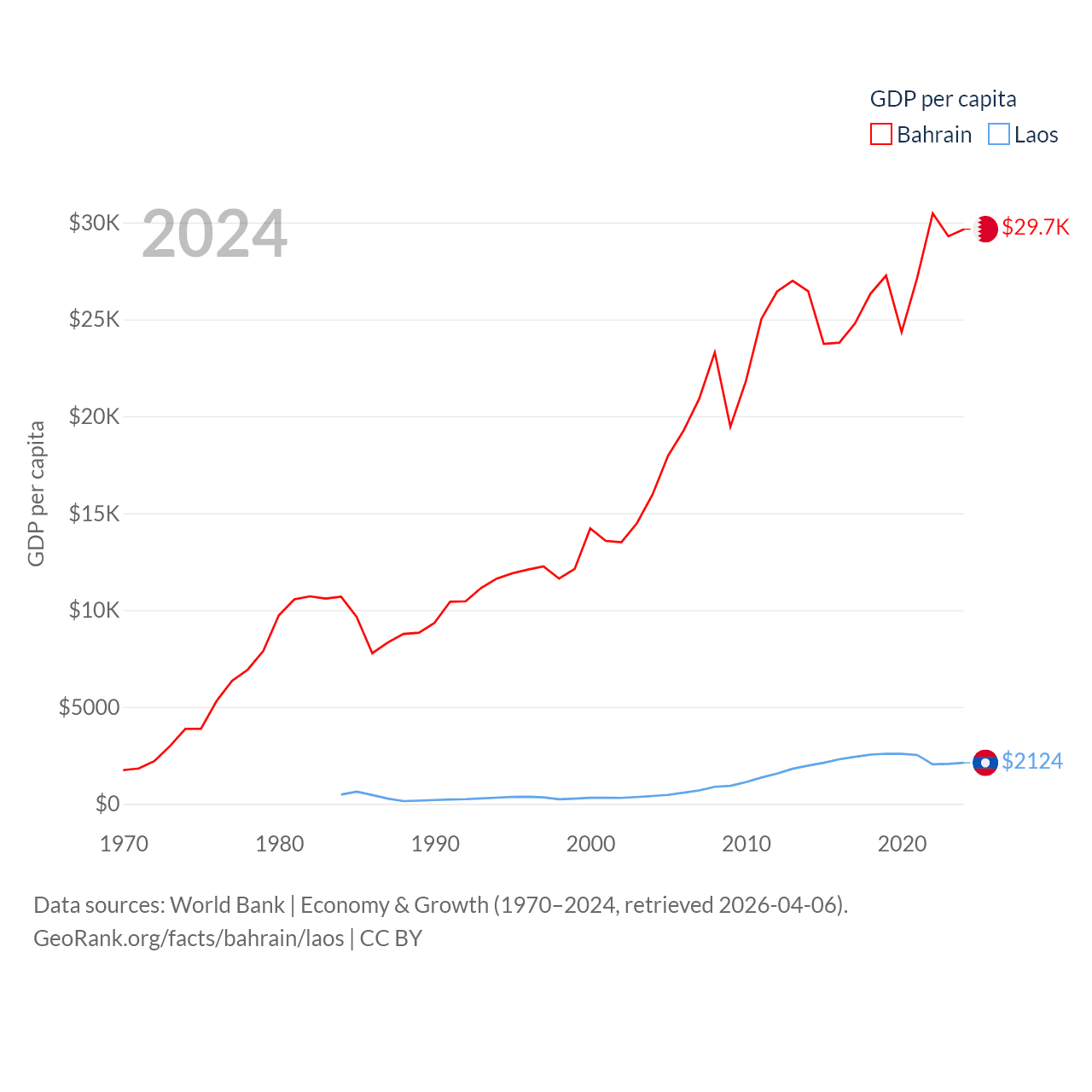 By GDP, Bahrain ranks 96/197 ($47.1B) and Laos ranks 139/197 ($16.5B). By GDP per capita, Bahrain ranks 42/197 ($29,654), while Laos ranks 155/197 ($2,124).