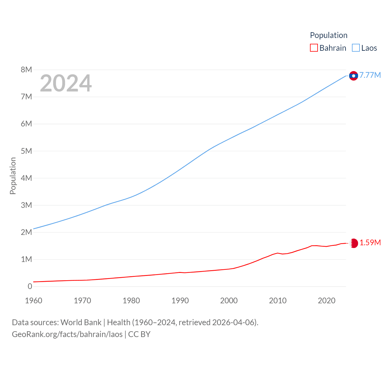 Bahrain has a population of 1.59M (ranked 151/197), compared with 7.77M in Laos (ranked 103/197). Bahrain's land area is 309 sq mi versus 89,112 sq mi for Laos (ranked 174th vs. 79th).