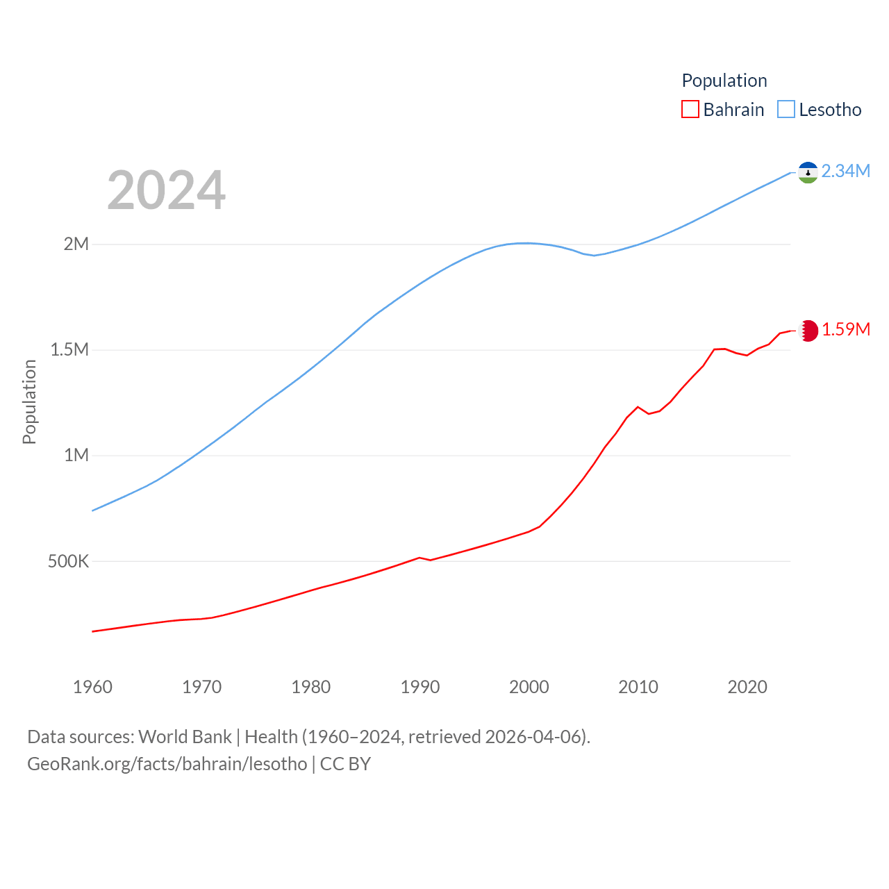 Bahrain has a population of 1.59M (ranked 151/197), compared with 2.34M in Lesotho (ranked 145/197). Bahrain's land area is 309 sq mi versus 11,722 sq mi for Lesotho (ranked 174th vs. 137th).