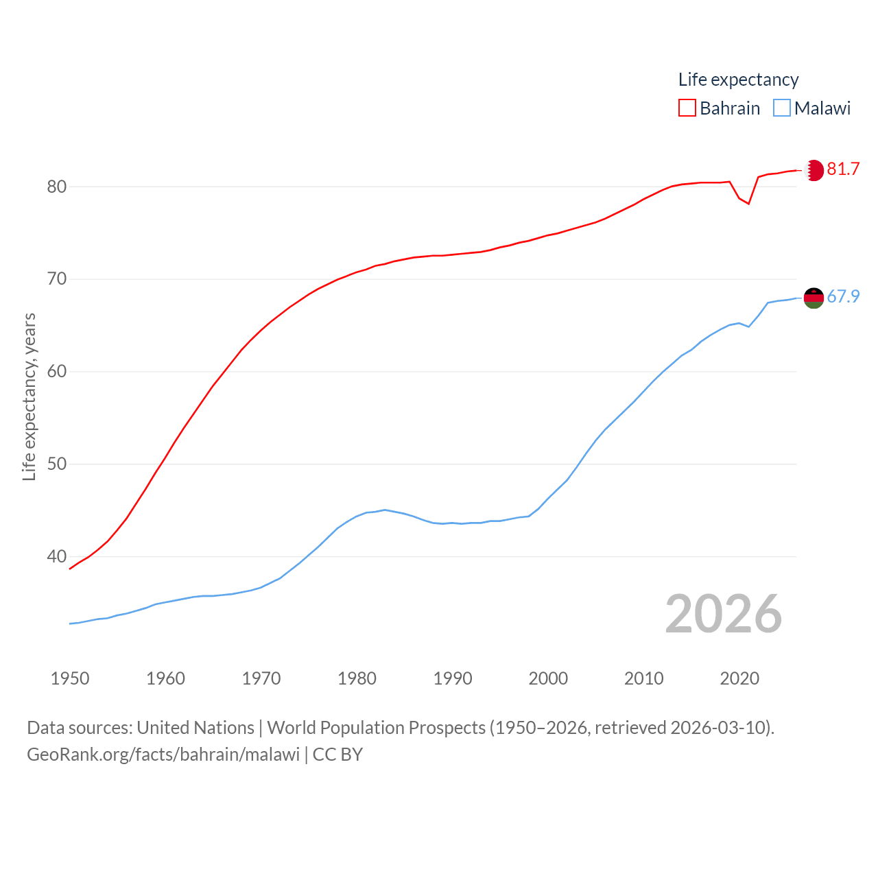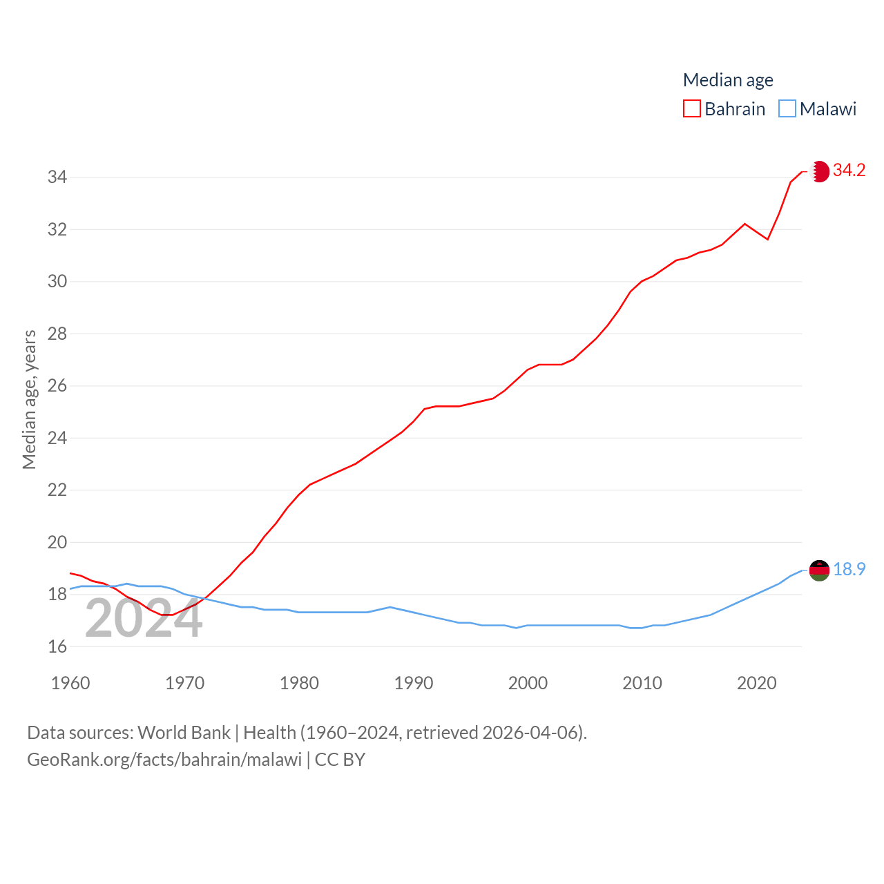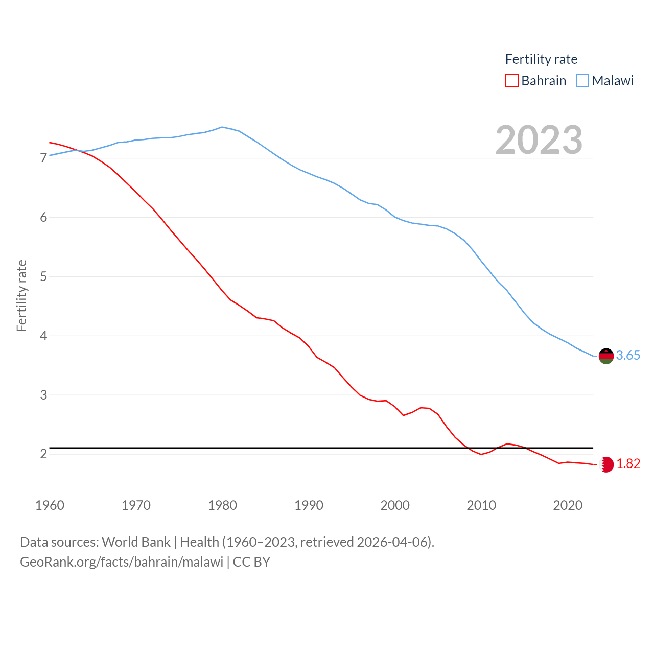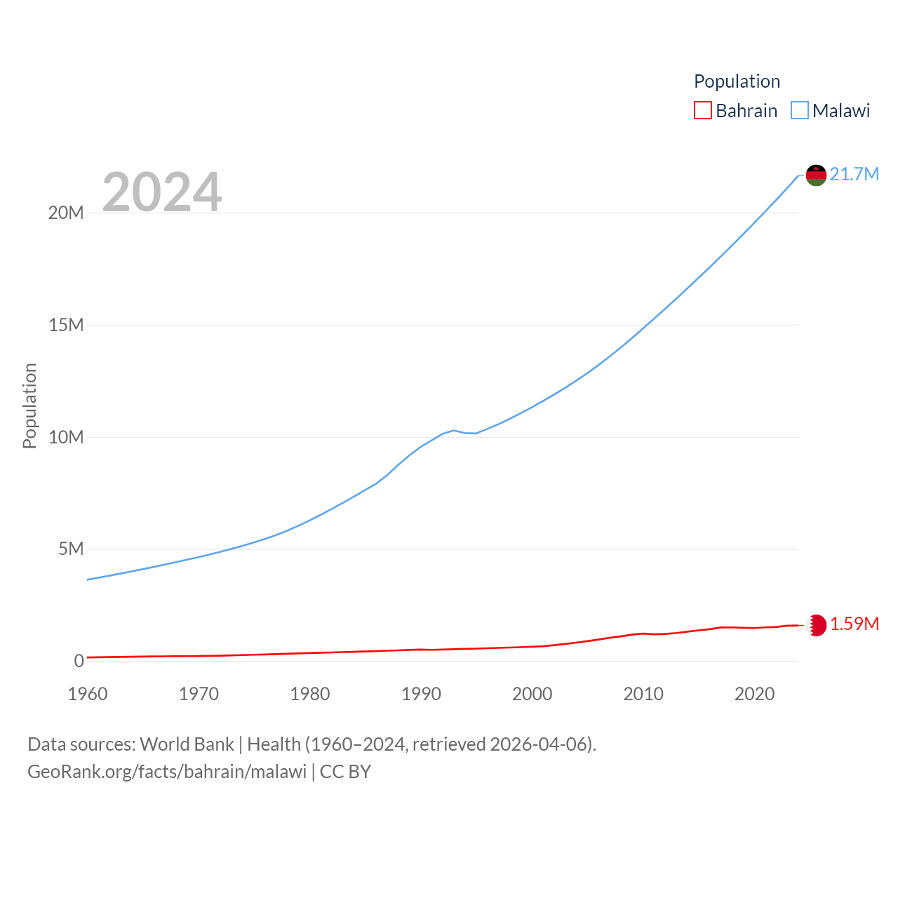Bahrain has a population of 1.59M (ranked 151/197), compared with 21.7M in Malawi (ranked 62/197). Bahrain's land area is 309 sq mi versus 36,402 sq mi for Malawi (ranked 174th vs. 107th).