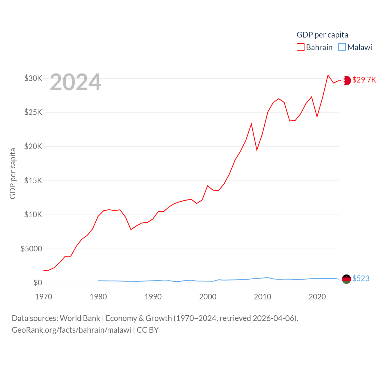 By GDP, Bahrain ranks 96/197 ($47.1B) and Malawi ranks 151/197 ($11.3B). By GDP per capita, Bahrain ranks 42/197 ($29,654), while Malawi ranks 194/197 ($523).