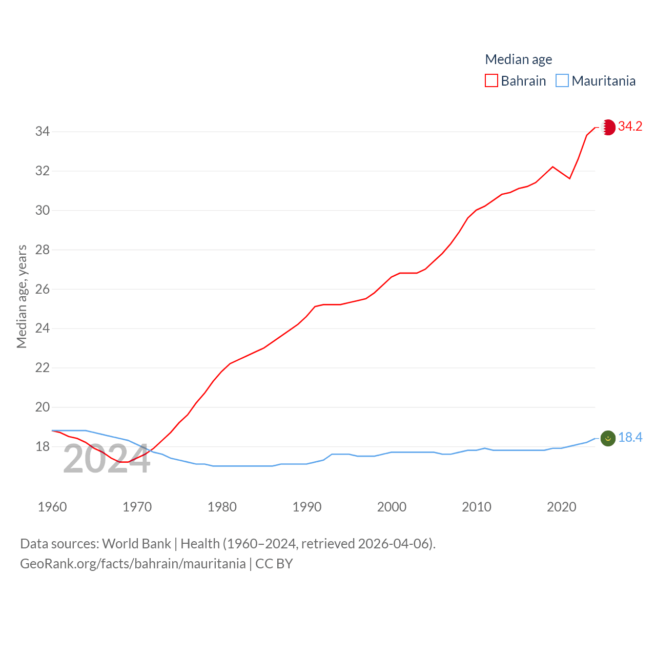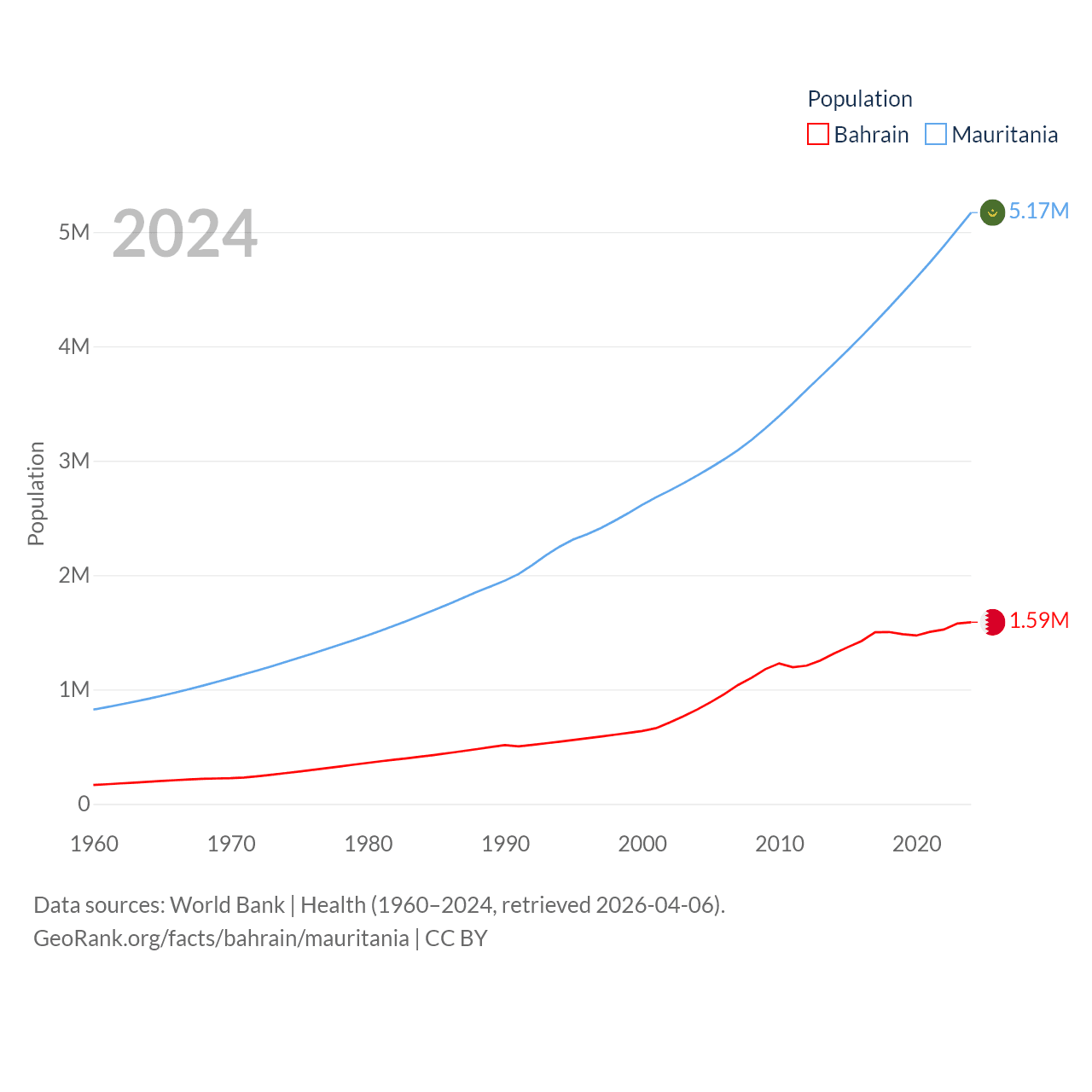 Bahrain has a population of 1.59M (ranked 151/197), compared with 5.17M in Mauritania (ranked 125/197). Bahrain's land area is 309 sq mi versus 397,955 sq mi for Mauritania (ranked 174th vs. 28th).