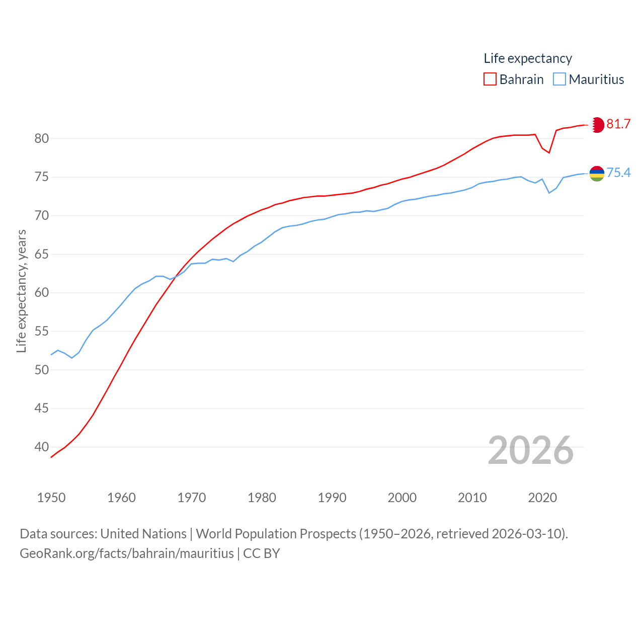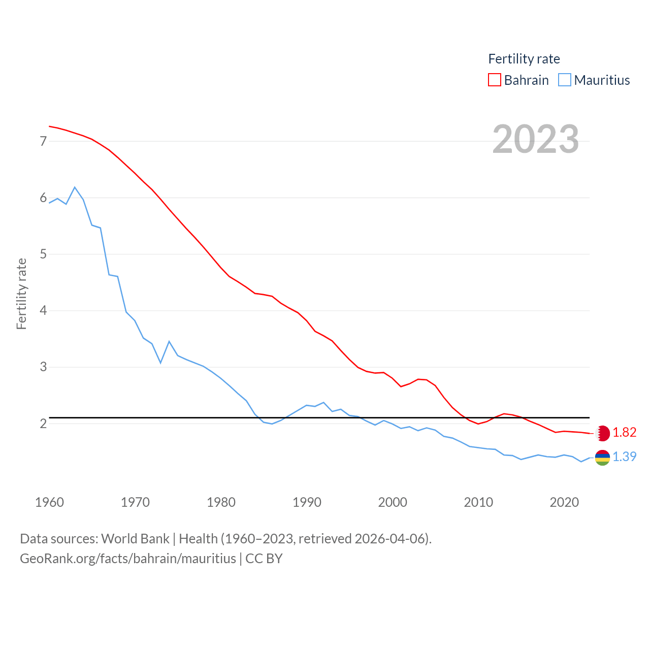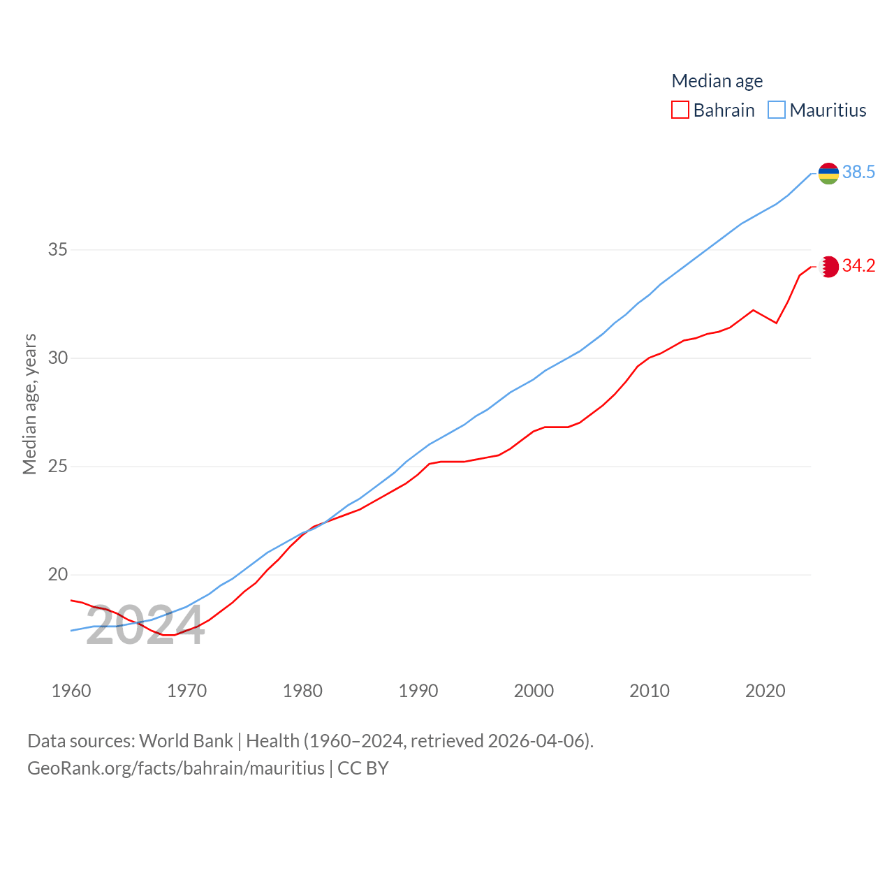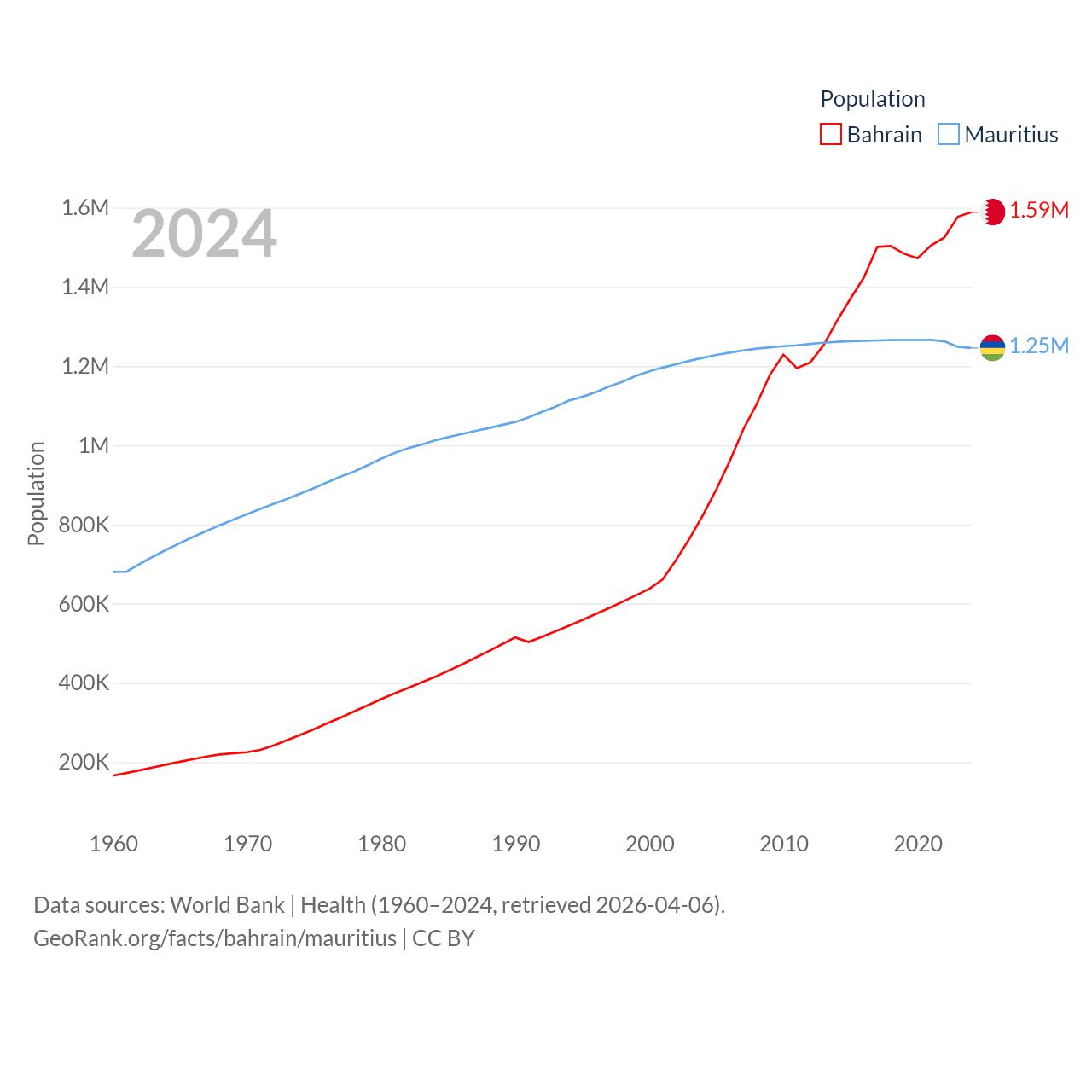 Bahrain has a population of 1.59M (ranked 151/197), compared with 1.25M in Mauritius (ranked 156/197). Bahrain's land area is 309 sq mi versus 771 sq mi for Mauritius (ranked 174th vs. 170th).