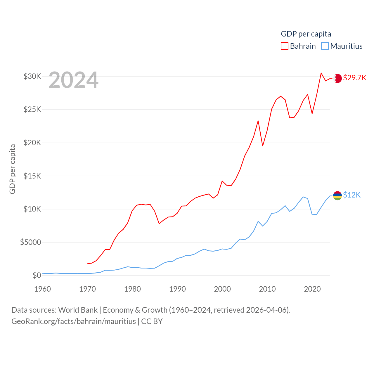 By GDP, Bahrain ranks 96/197 ($47.1B) and Mauritius ranks 143/197 ($14.9B). By GDP per capita, Bahrain ranks 42/197 ($29,654), while Mauritius ranks 78/197 ($11,991).