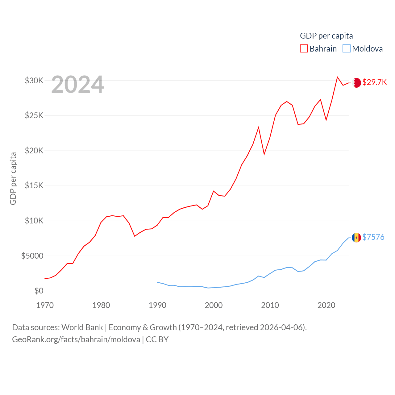 By GDP, Bahrain ranks 96/197 ($47.1B) and Moldova ranks 134/197 ($18.2B). By GDP per capita, Bahrain ranks 42/197 ($29,654), while Moldova ranks 99/197 ($7,576).