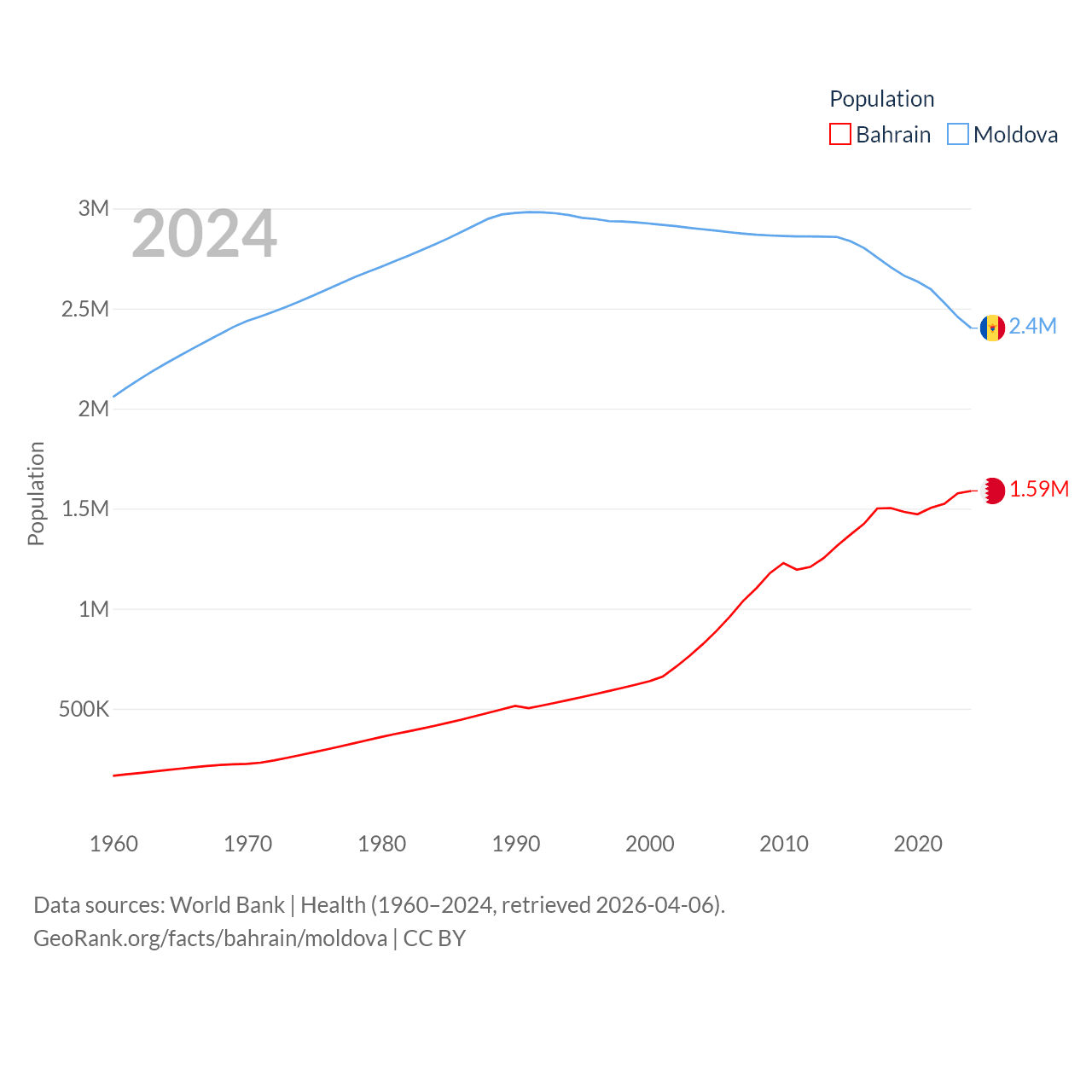 Bahrain has a population of 1.59M (ranked 151/197), compared with 2.4M in Moldova (ranked 143/197). Bahrain's land area is 309 sq mi versus 12,714 sq mi for Moldova (ranked 174th vs. 135th).