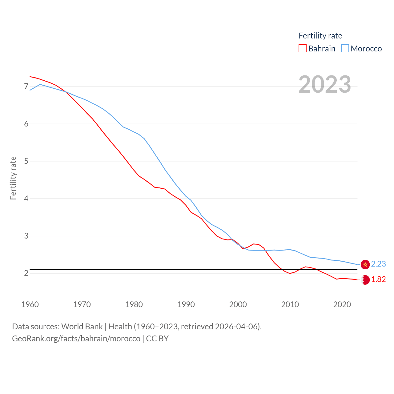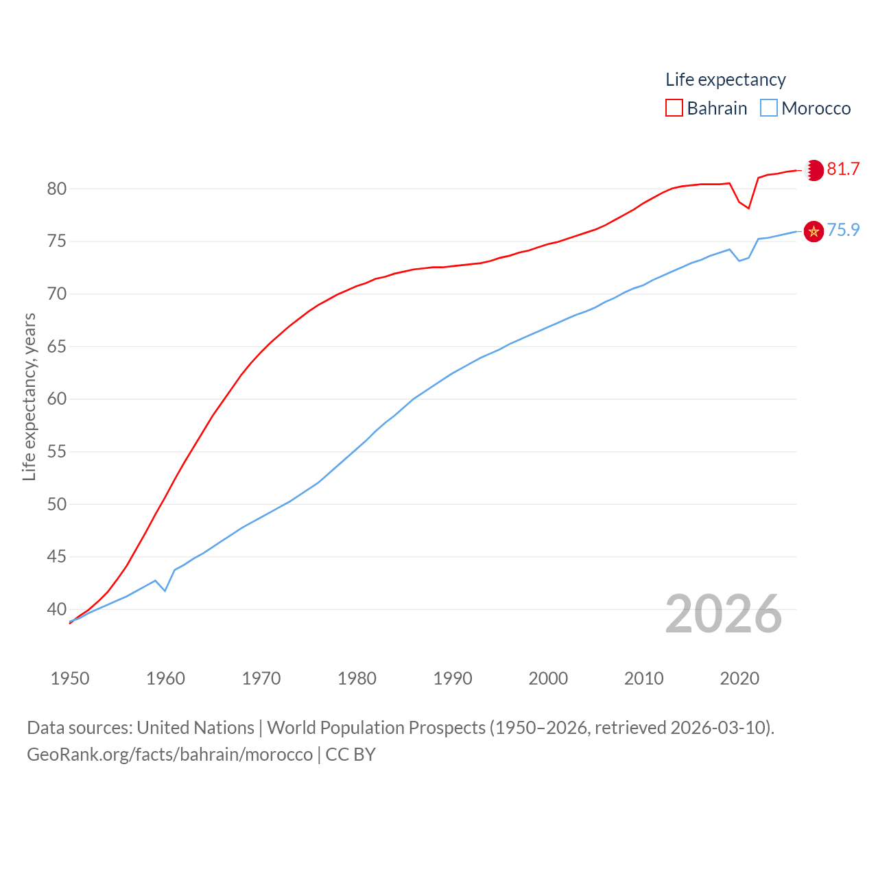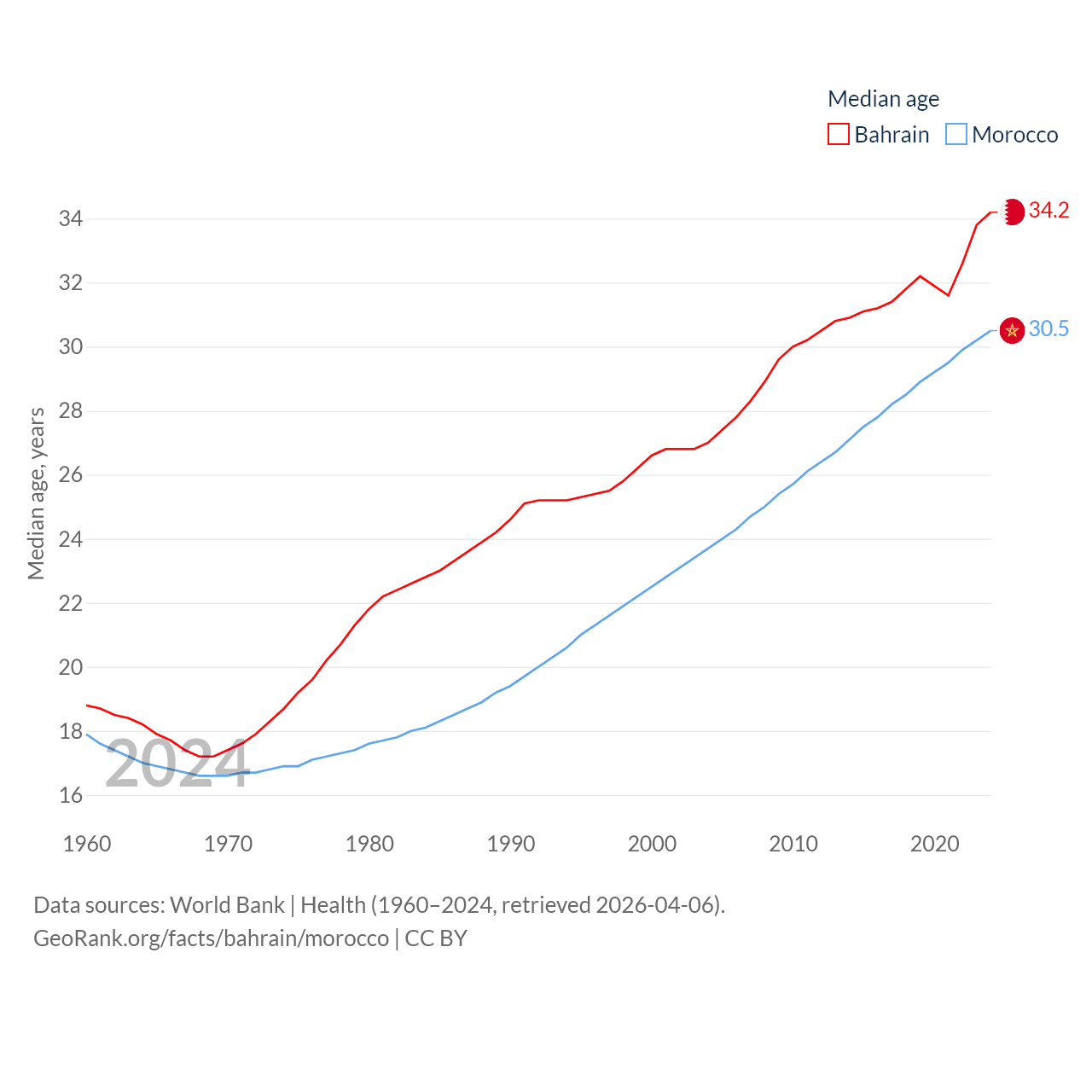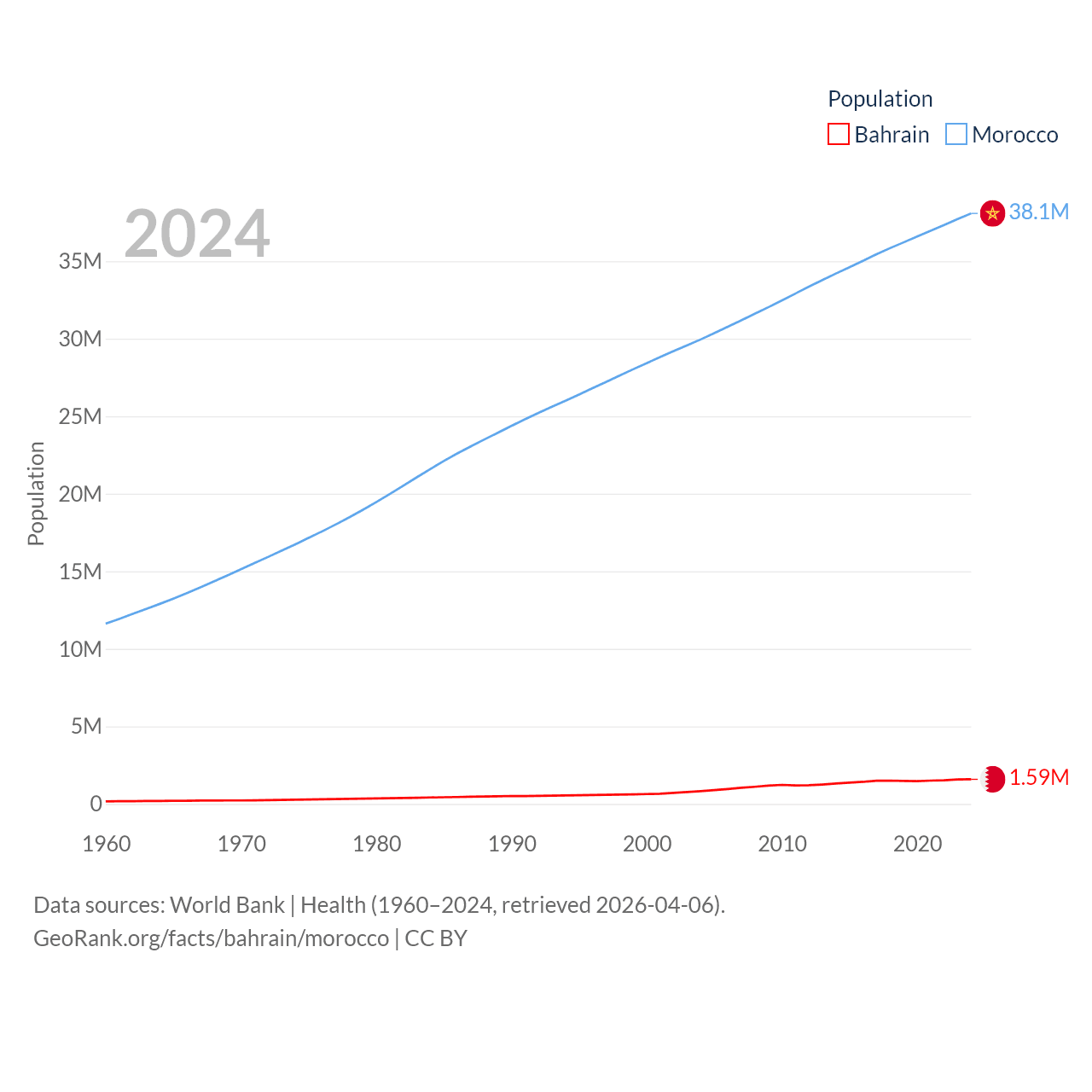 Bahrain has a population of 1.59M (ranked 151/197), compared with 38.1M in Morocco (ranked 39/197). Bahrain's land area is 309 sq mi versus 172,317 sq mi for Morocco (ranked 174th vs. 55th).