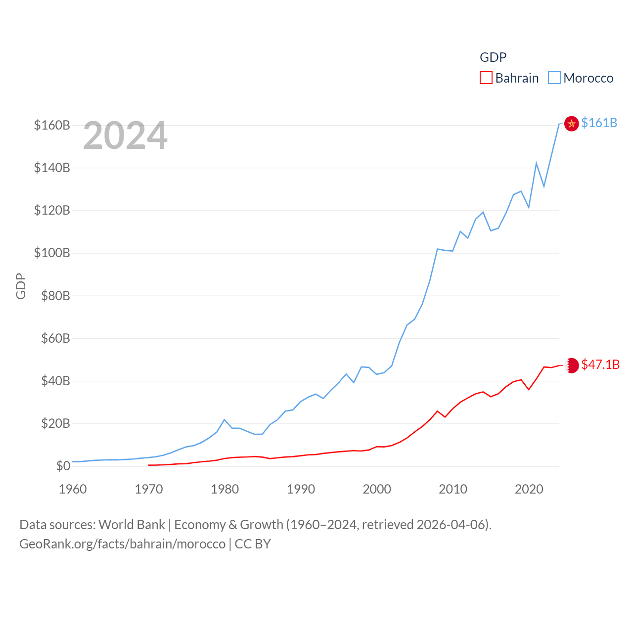By GDP, Bahrain ranks 96/197 ($47.1B) and Morocco ranks 58/197 ($161B). By GDP per capita, Bahrain ranks 42/197 ($29,654), while Morocco ranks 127/197 ($4,218).