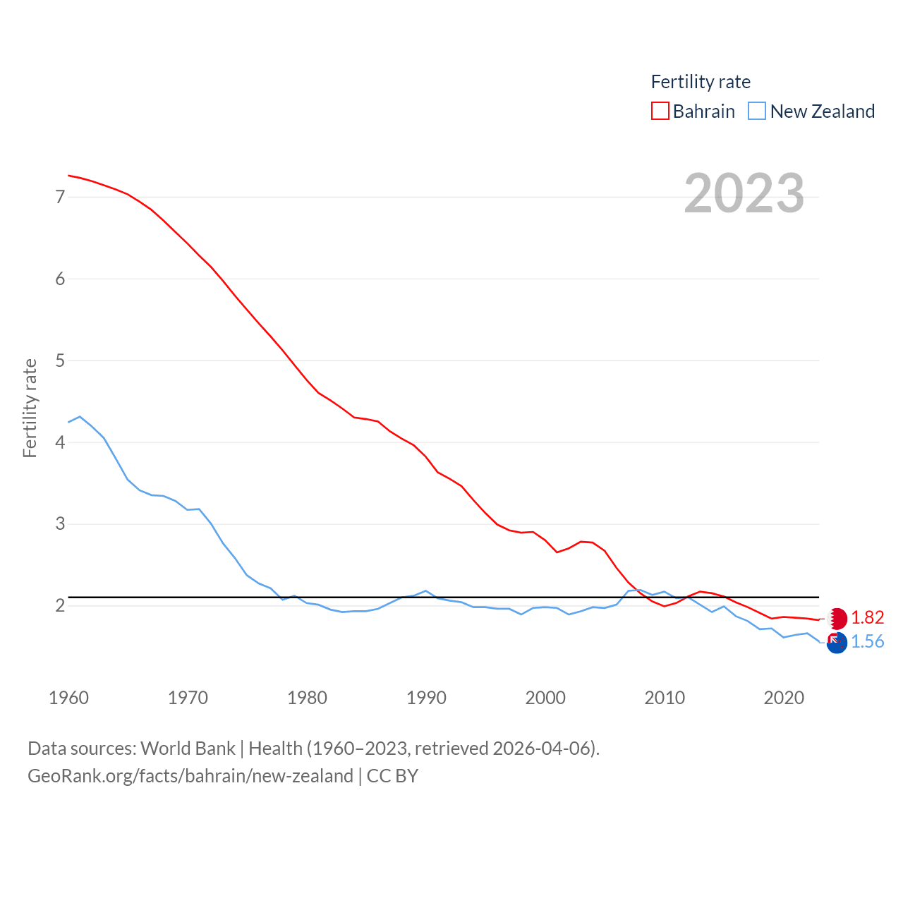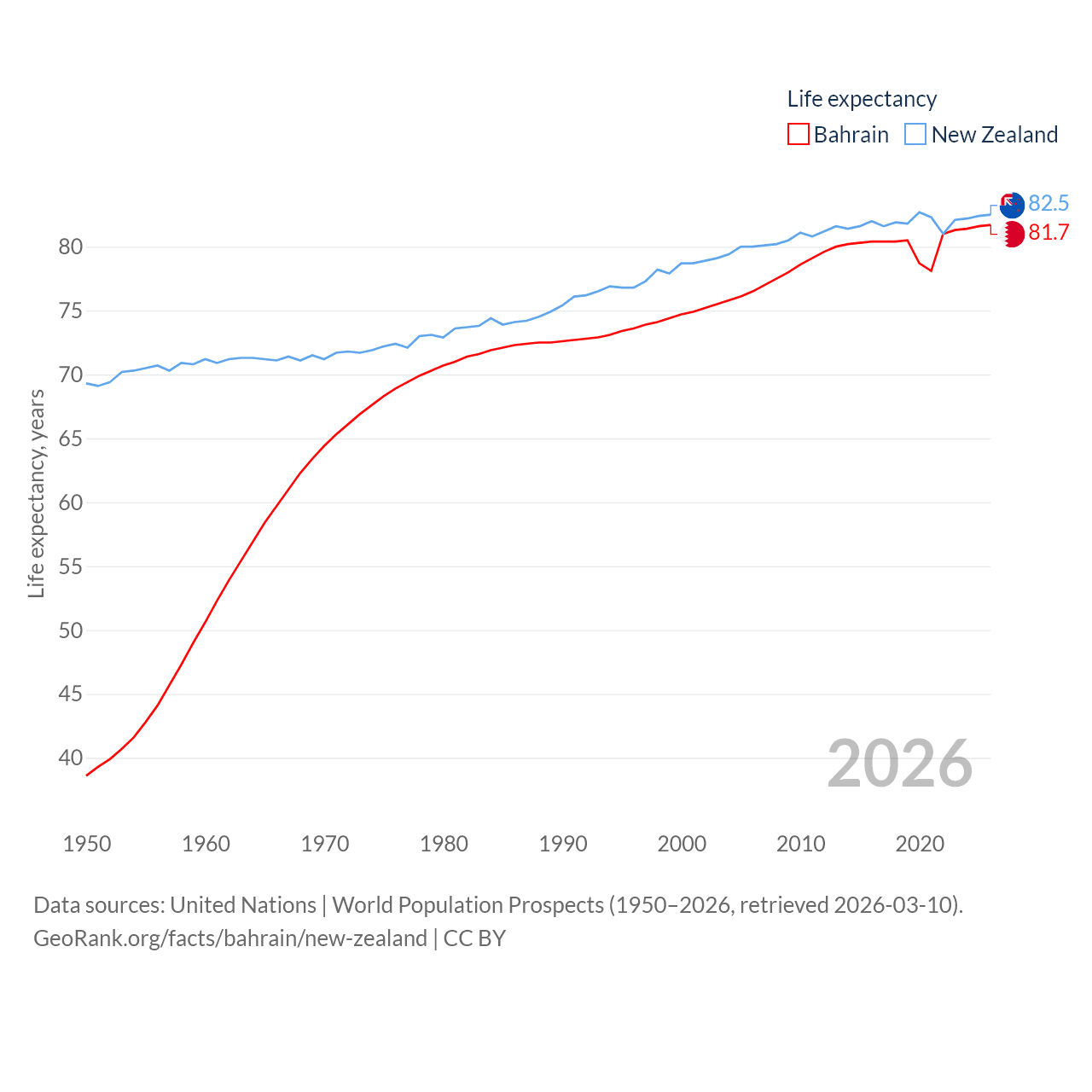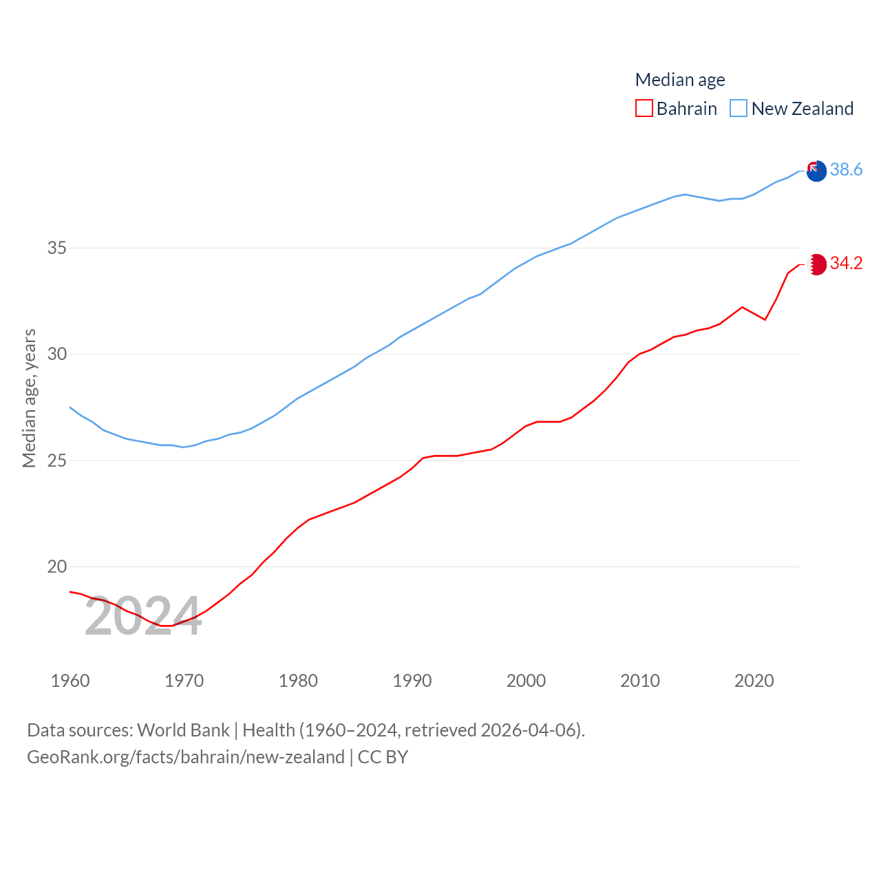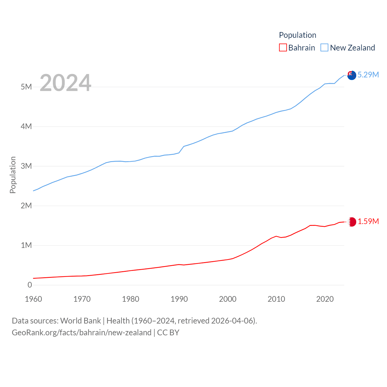 Bahrain has a population of 1.59M (ranked 151/197), compared with 5.29M in New Zealand (ranked 123/197). Bahrain's land area is 309 sq mi versus 101,665 sq mi for New Zealand (ranked 174th vs. 74th).
