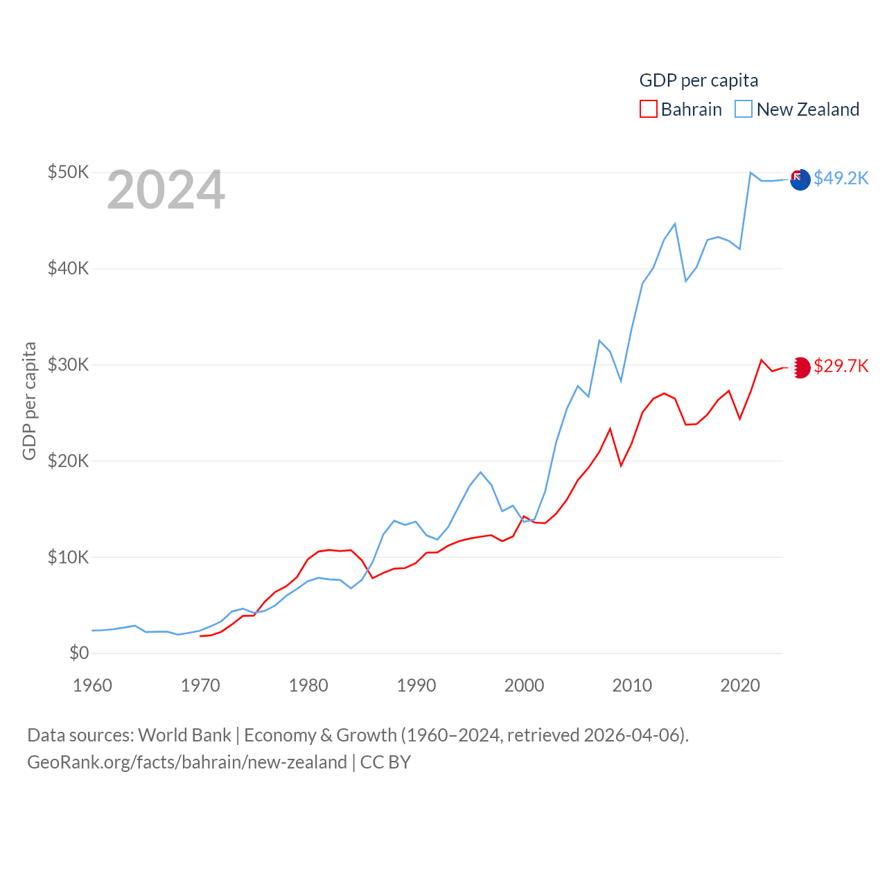 By GDP, Bahrain ranks 96/197 ($47.1B) and New Zealand ranks 52/197 ($260B). By GDP per capita, Bahrain ranks 42/197 ($29,654), while New Zealand ranks 26/197 ($49,205).