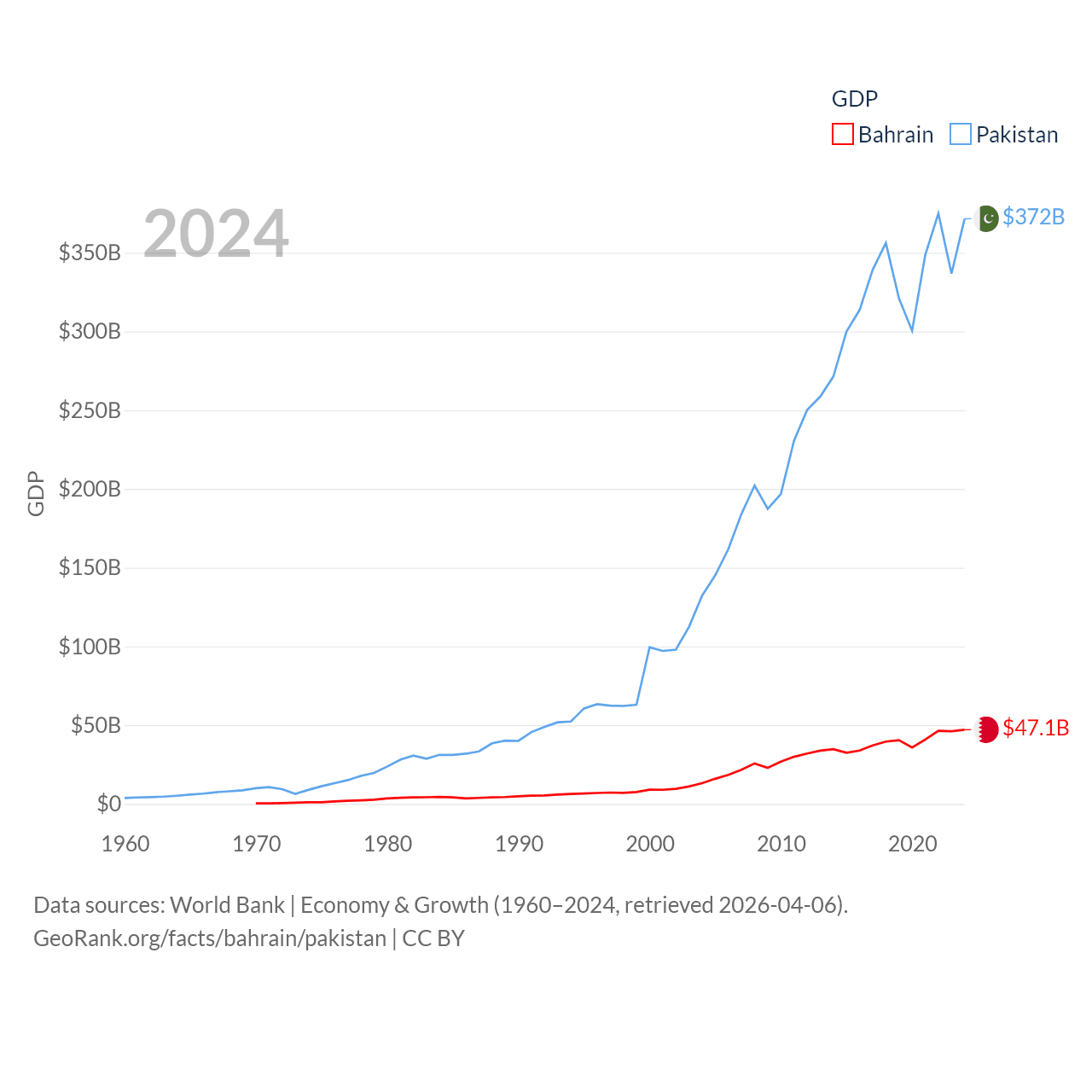 By GDP, Bahrain ranks 96/197 ($47.1B) and Pakistan ranks 43/197 ($372B). By GDP per capita, Bahrain ranks 42/197 ($29,654), while Pakistan ranks 163/197 ($1,479).