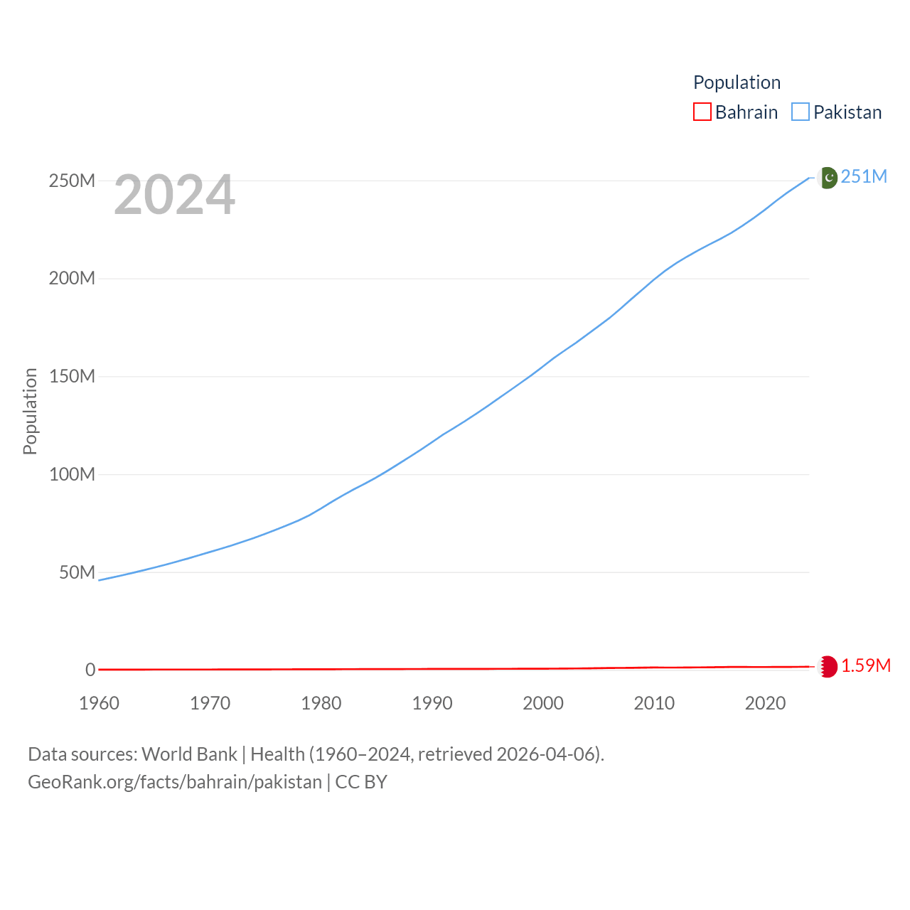 Bahrain has a population of 1.59M (ranked 151/197), compared with 251M in Pakistan (ranked 5/197). Bahrain's land area is 309 sq mi versus 297,638 sq mi for Pakistan (ranked 174th vs. 35th).