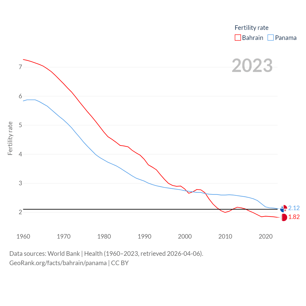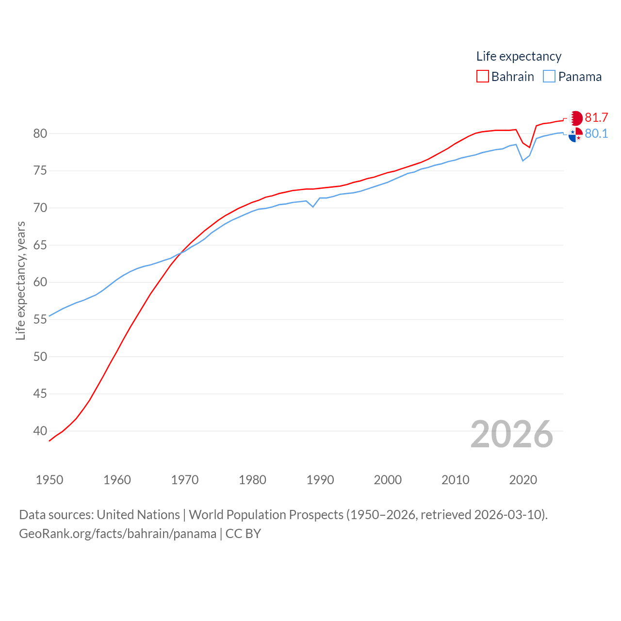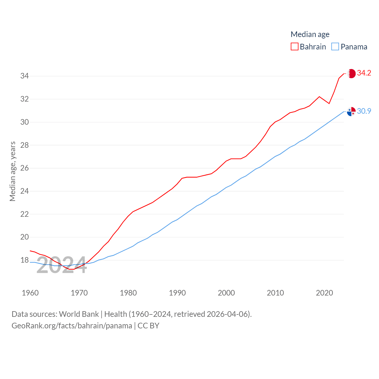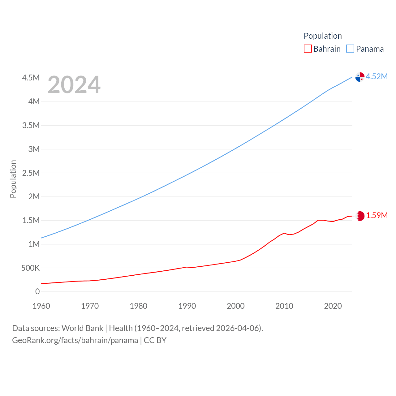 Bahrain has a population of 1.59M (ranked 151/197), compared with 4.52M in Panama (ranked 128/197). Bahrain's land area is 309 sq mi versus 28,641 sq mi for Panama (ranked 174th vs. 115th).