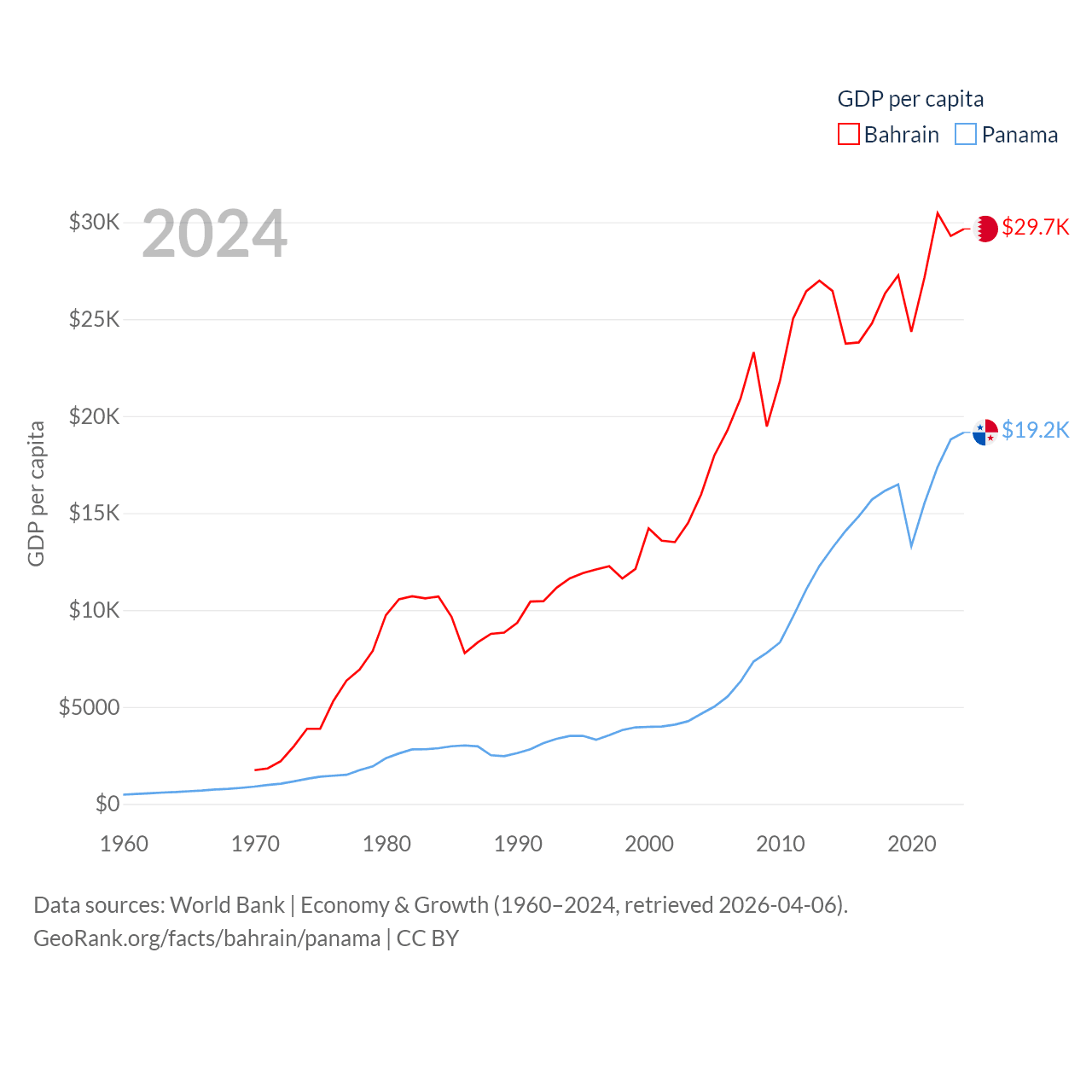 By GDP, Bahrain ranks 96/197 ($47.1B) and Panama ranks 78/197 ($86.5B). By GDP per capita, Bahrain ranks 42/197 ($29,654), while Panama ranks 60/197 ($19,161).