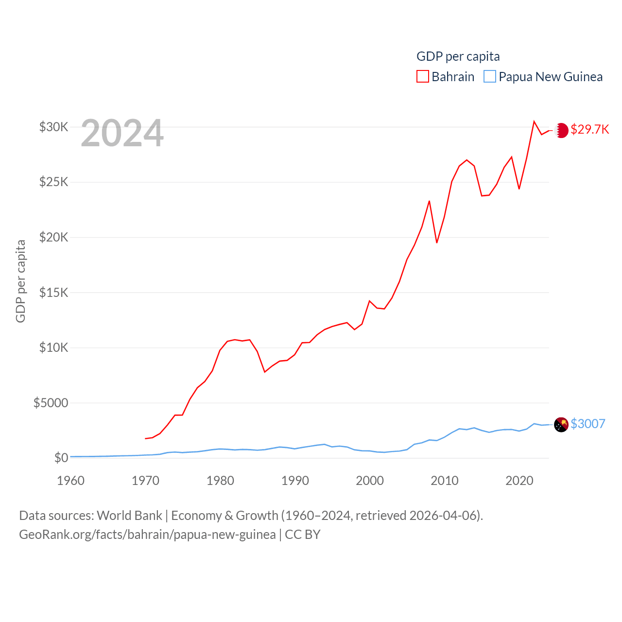 By GDP, Bahrain ranks 96/197 ($47.1B) and Papua New Guinea ranks 110/197 ($31.8B). By GDP per capita, Bahrain ranks 42/197 ($29,654), while Papua New Guinea ranks 140/197 ($3,007).