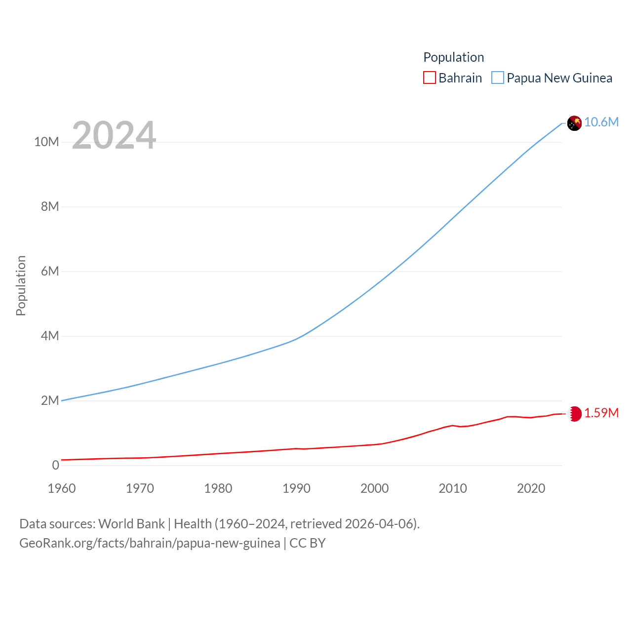 Bahrain has a population of 1.59M (ranked 151/197), compared with 10.6M in Papua New Guinea (ranked 92/197). Bahrain's land area is 309 sq mi versus 174,850 sq mi for Papua New Guinea (ranked 174th vs. 54th).
