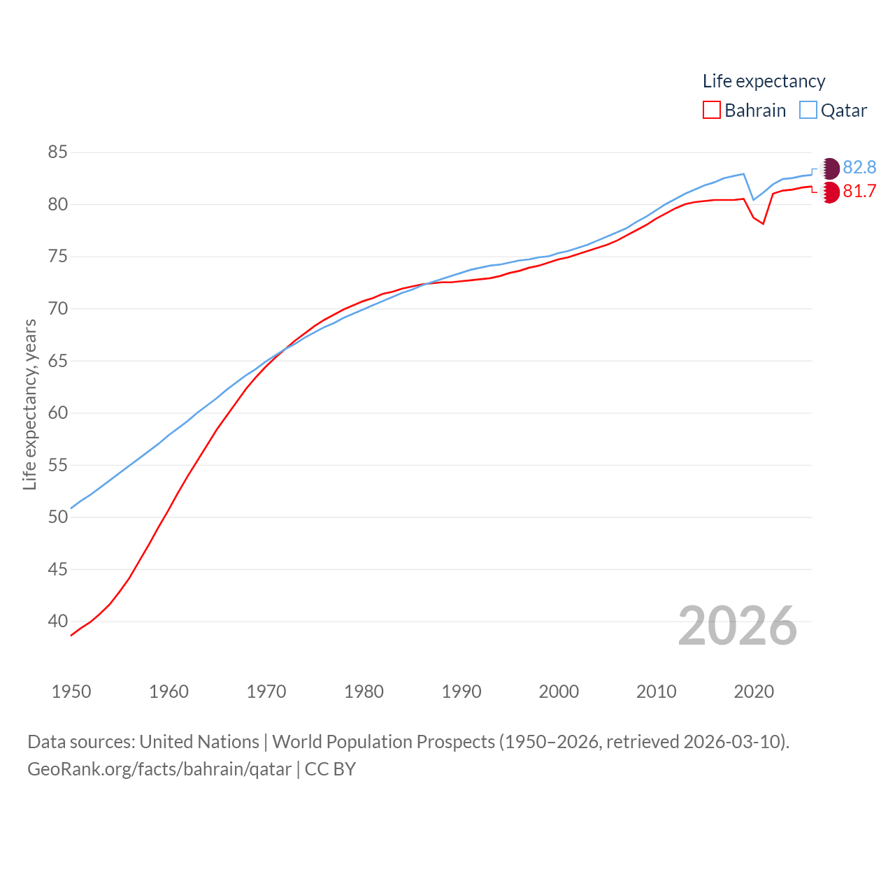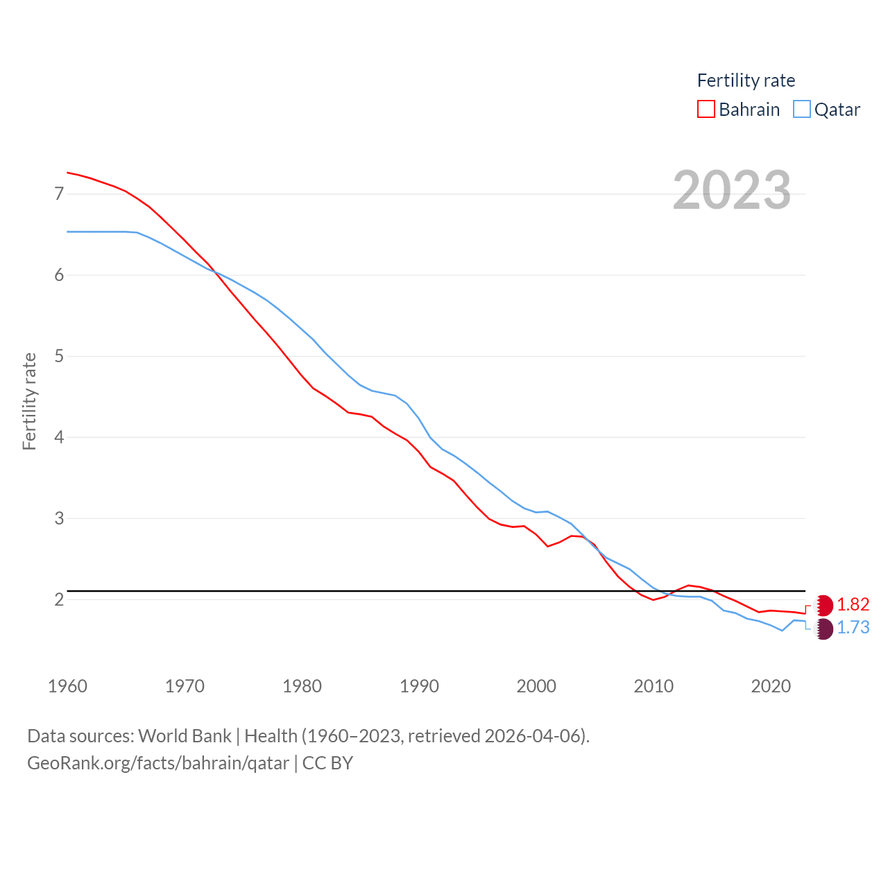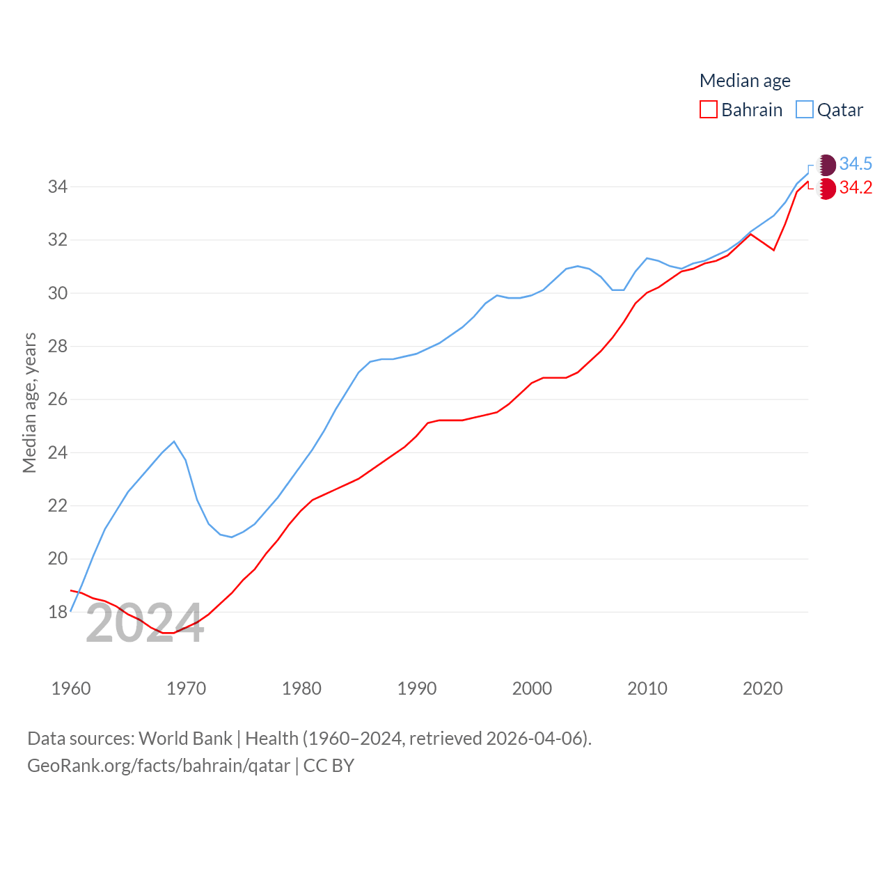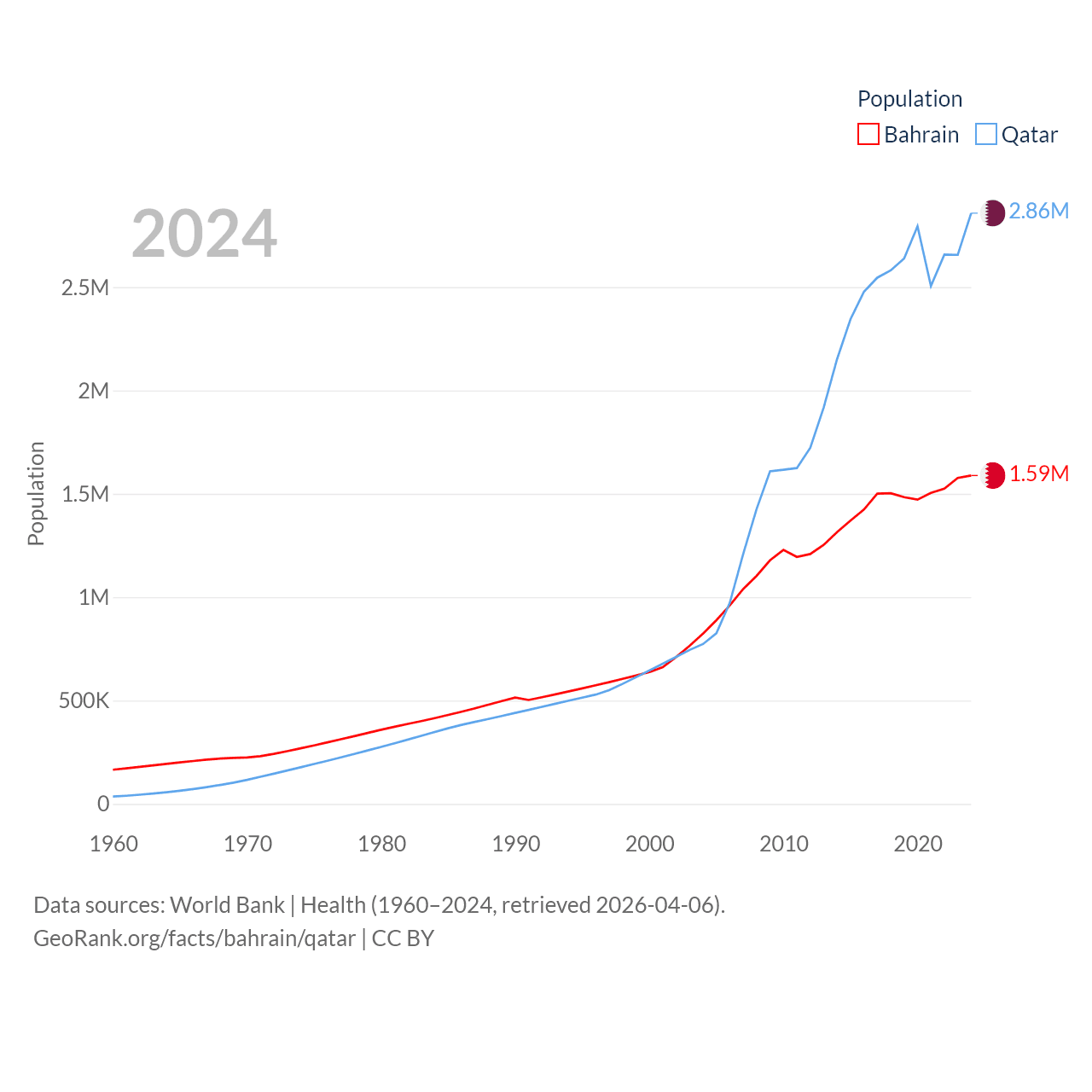 Bahrain has a population of 1.59M (ranked 151/197), compared with 2.86M in Qatar (ranked 138/197). Bahrain's land area is 309 sq mi versus 4,436 sq mi for Qatar (ranked 174th vs. 158th).