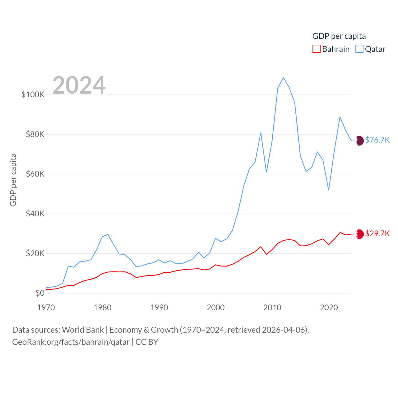 By GDP, Bahrain ranks 96/197 ($47.1B) and Qatar ranks 56/197 ($219B). By GDP per capita, Bahrain ranks 42/197 ($29,654), while Qatar ranks 11/197 ($76,689).