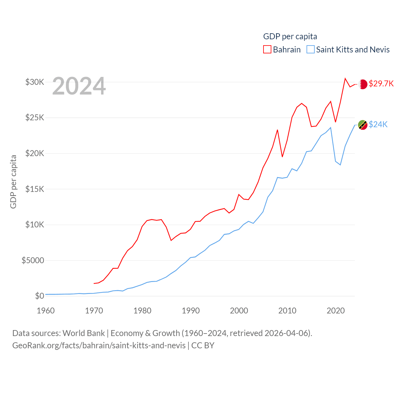By GDP, Bahrain ranks 96/197 ($47.1B) and Saint Kitts and Nevis ranks 187/197 ($1.12B). By GDP per capita, Bahrain ranks 42/197 ($29,654), while Saint Kitts and Nevis ranks 51/197 ($23,961).