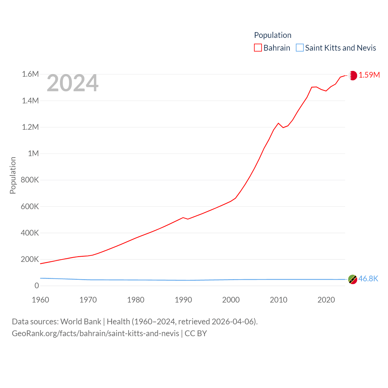Bahrain has a population of 1.59M (ranked 151/197), compared with 46.8K in Saint Kitts and Nevis (ranked 189/197). Bahrain's land area is 309 sq mi versus 100.4 sq mi for Saint Kitts and Nevis (ranked 174th vs. 189th).
