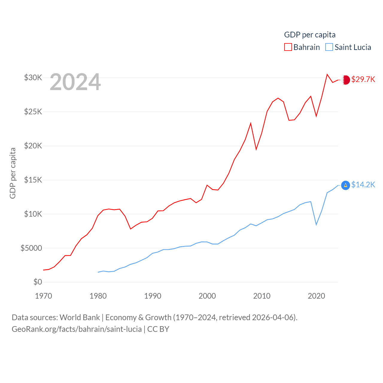 By GDP, Bahrain ranks 96/197 ($47.1B) and Saint Lucia ranks 173/197 ($2.55B). By GDP per capita, Bahrain ranks 42/197 ($29,654), while Saint Lucia ranks 70/197 ($14,182).
