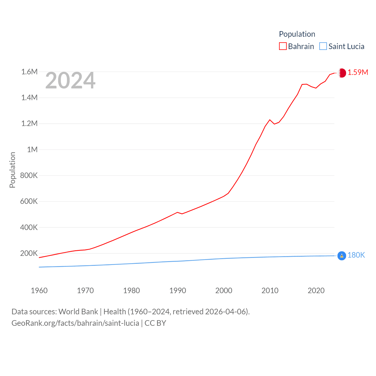 Bahrain has a population of 1.59M (ranked 151/197), compared with 180K in Saint Lucia (ranked 178/197). Bahrain's land area is 309 sq mi versus 235.5 sq mi for Saint Lucia (ranked 174th vs. 178th).