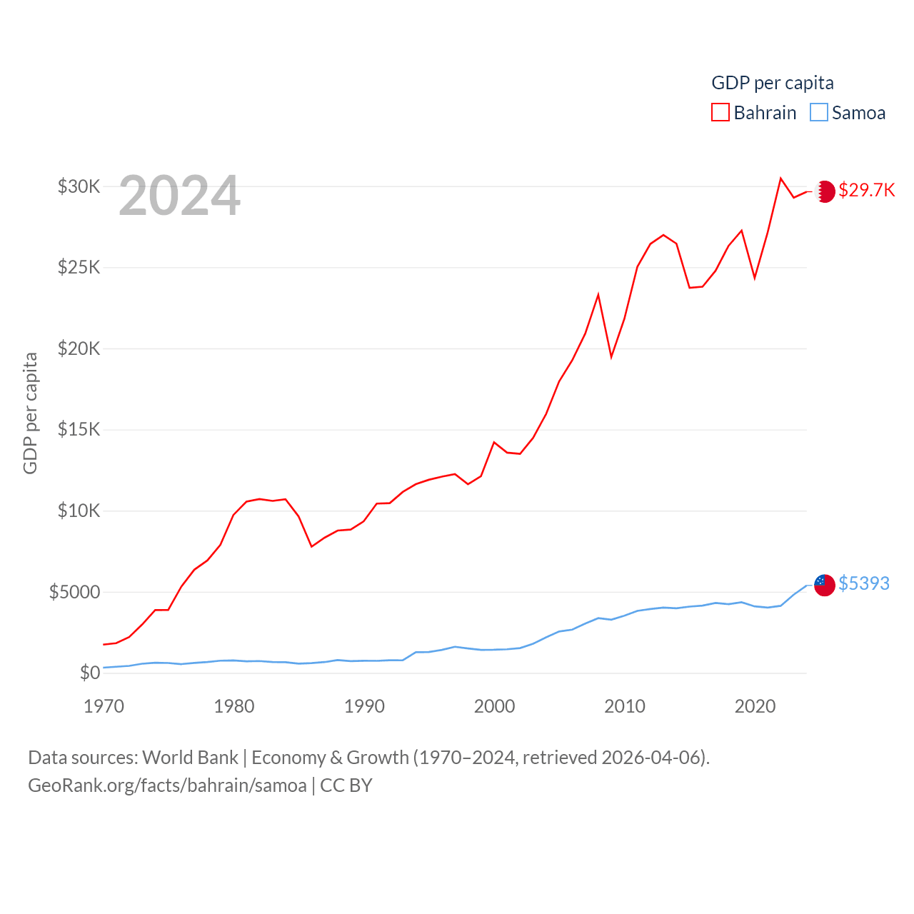 By GDP, Bahrain ranks 96/197 ($47.1B) and Samoa ranks 185/197 ($1.18B). By GDP per capita, Bahrain ranks 42/197 ($29,654), while Samoa ranks 117/197 ($5,393).