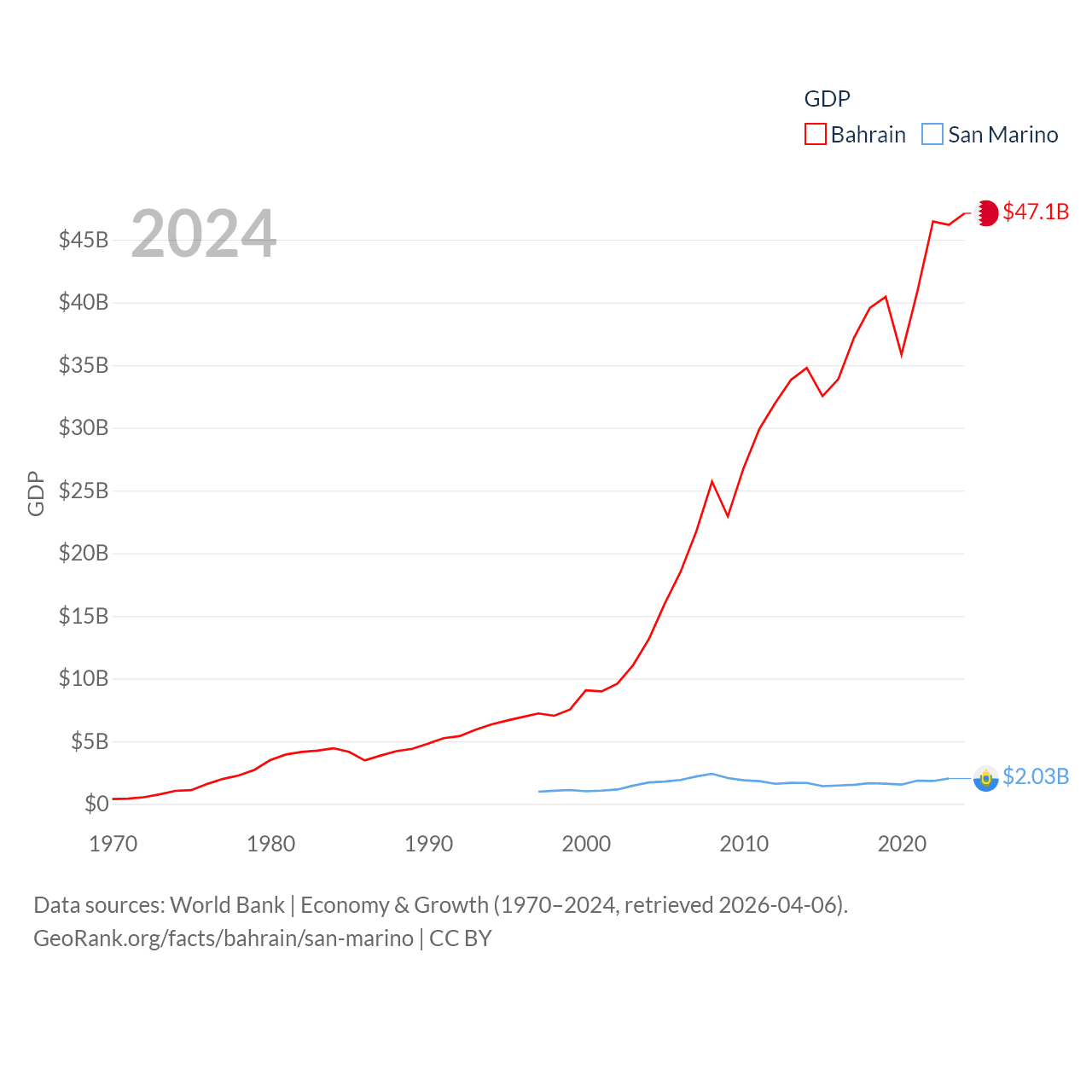 By GDP, Bahrain ranks 96/197 ($47.1B) and San Marino ranks 180/197 ($2.03B). By GDP per capita, Bahrain ranks 42/197 ($29,654), while San Marino ranks 15/197 ($59,880).