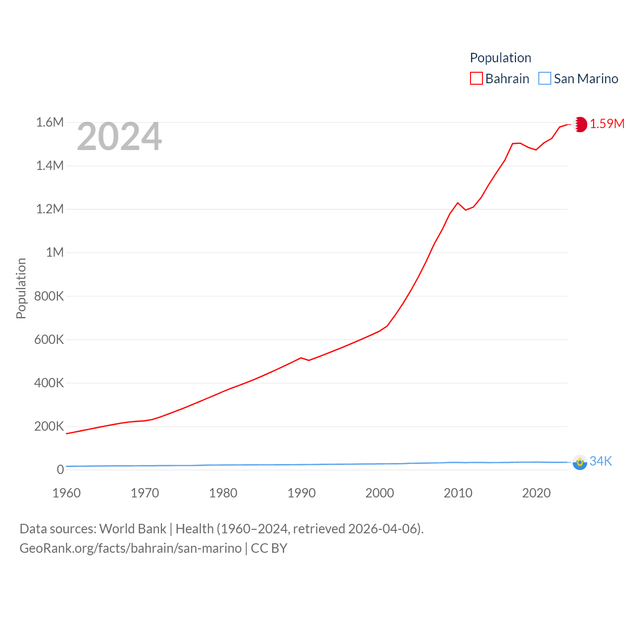 Bahrain has a population of 1.59M (ranked 151/197), compared with 34K in San Marino (ranked 193/197). Bahrain's land area is 309 sq mi versus 23.2 sq mi for San Marino (ranked 174th vs. 193rd).