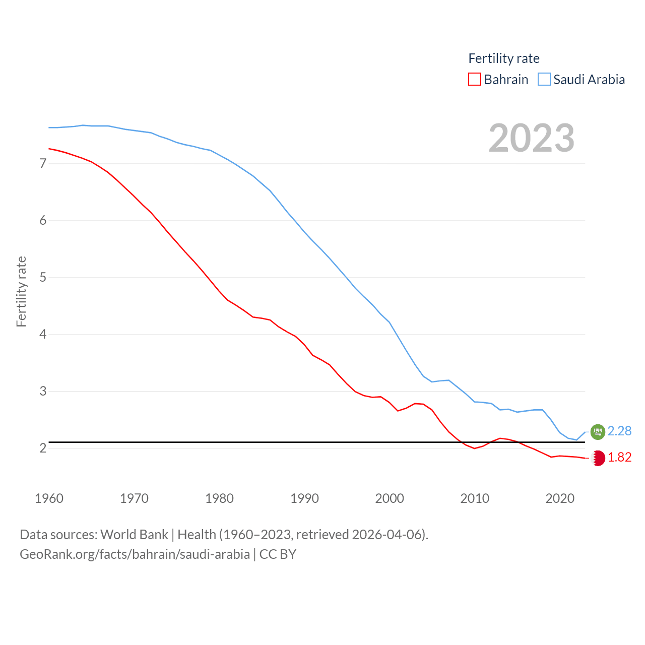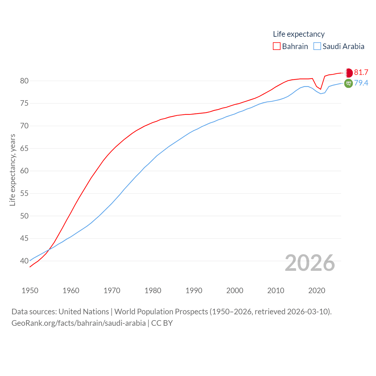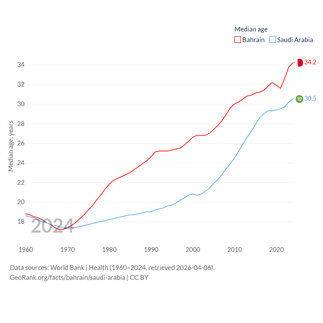 Bahrain has a population of 1.59M (ranked 151/197), compared with 35.3M in Saudi Arabia (ranked 45/197). Bahrain's land area is 309 sq mi versus 830,000 sq mi for Saudi Arabia (ranked 174th vs. 12th).