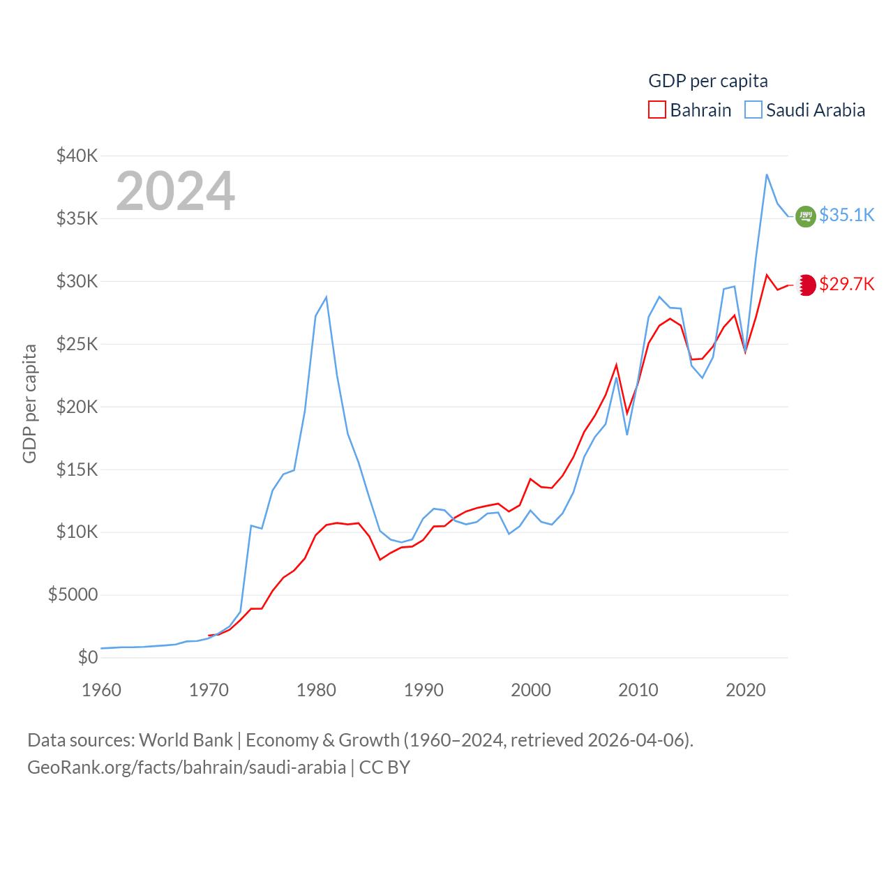 By GDP, Bahrain ranks 96/197 ($47.1B) and Saudi Arabia ranks 18/197 ($1.24T). By GDP per capita, Bahrain ranks 42/197 ($29,654), while Saudi Arabia ranks 33/197 ($35,122).