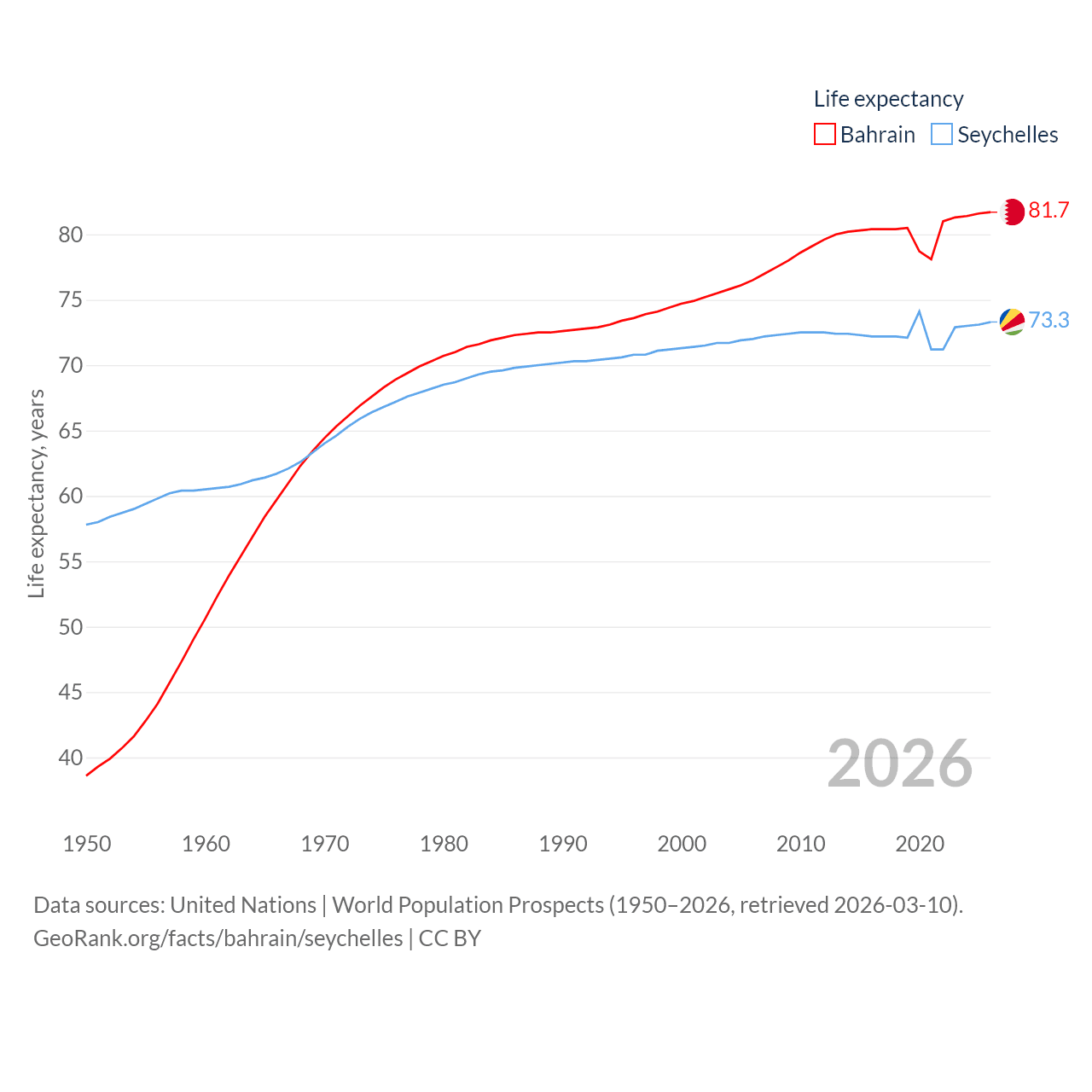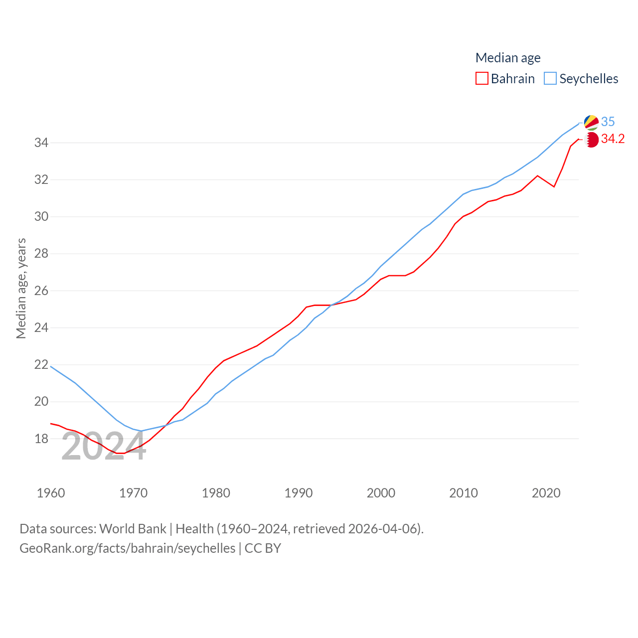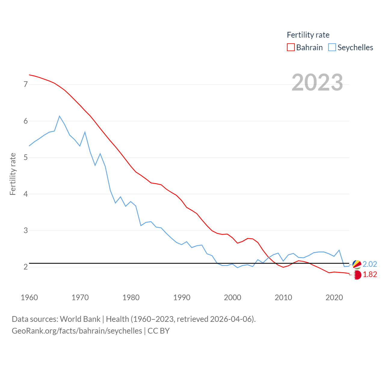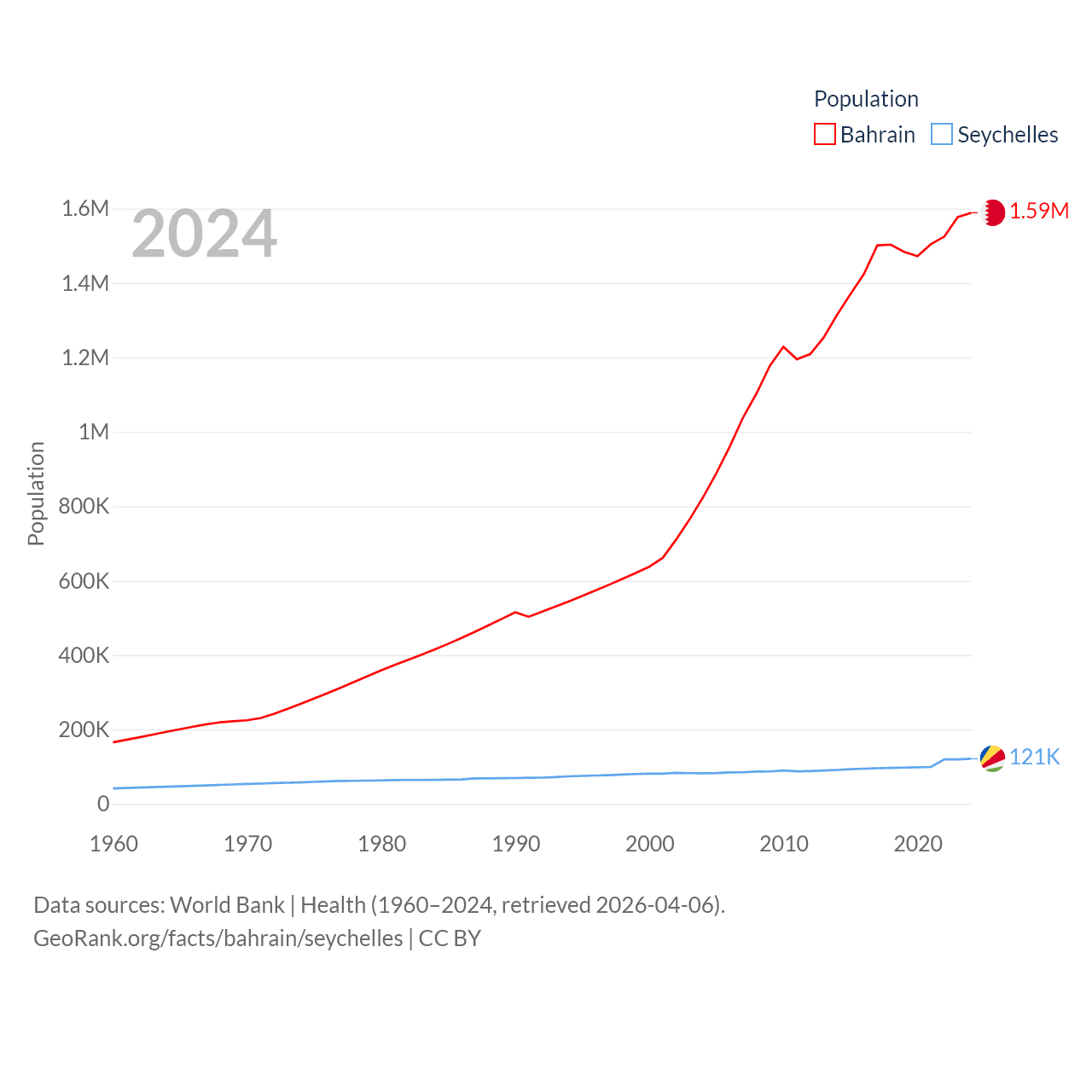 Bahrain has a population of 1.59M (ranked 151/197), compared with 121K in The Seychelles (ranked 181/197). Bahrain's land area is 309 sq mi versus 177.6 sq mi for The Seychelles (ranked 174th vs. 181st).