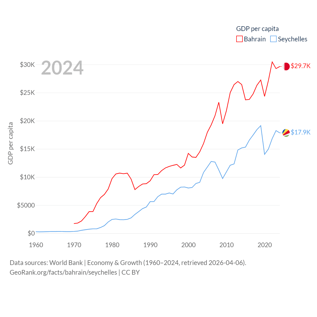 By GDP, Bahrain ranks 96/197 ($47.1B) and The Seychelles ranks 178/197 ($2.17B). By GDP per capita, Bahrain ranks 42/197 ($29,654), while The Seychelles ranks 63/197 ($17,859).