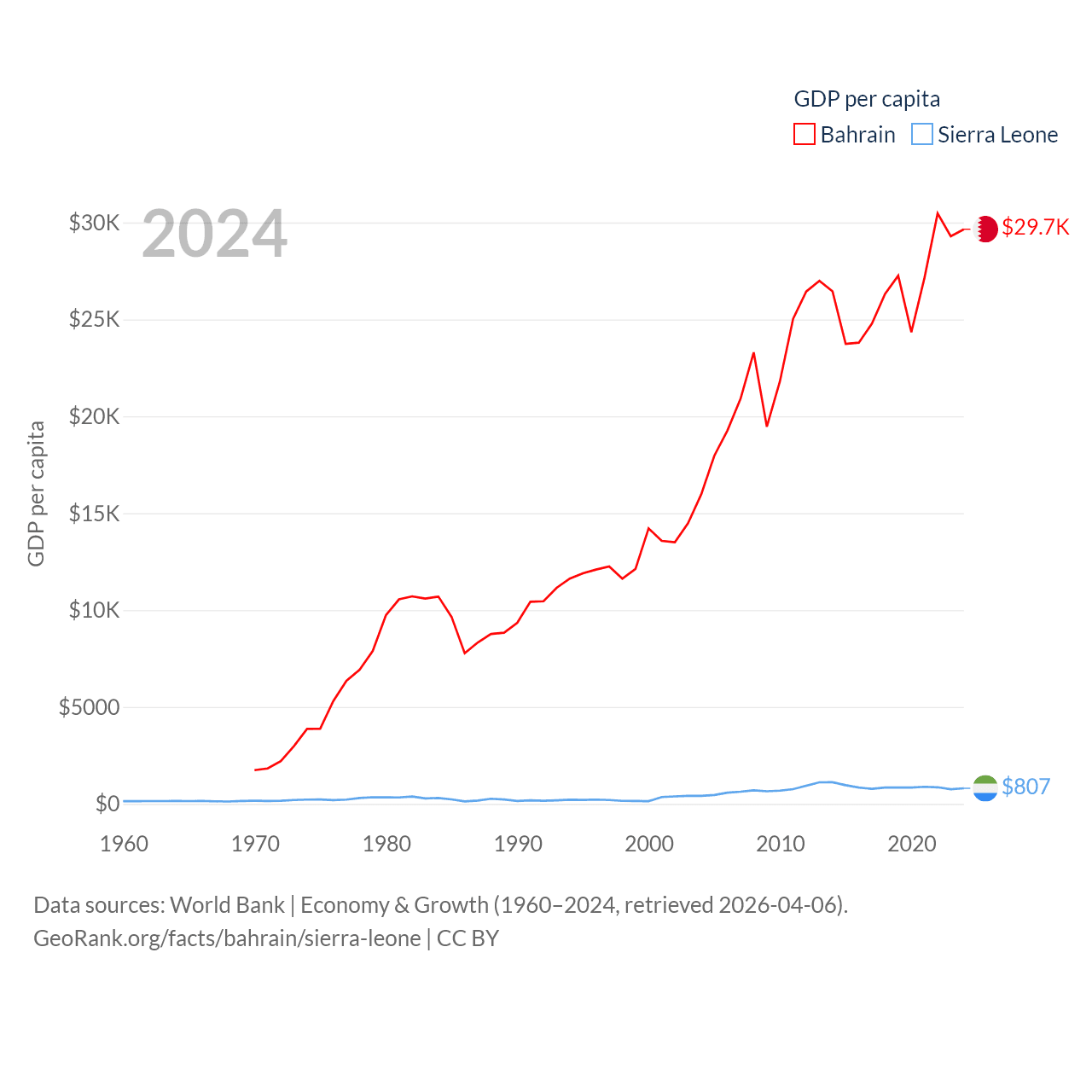 By GDP, Bahrain ranks 96/197 ($47.1B) and Sierra Leone ranks 160/197 ($6.97B). By GDP per capita, Bahrain ranks 42/197 ($29,654), while Sierra Leone ranks 186/197 ($807).