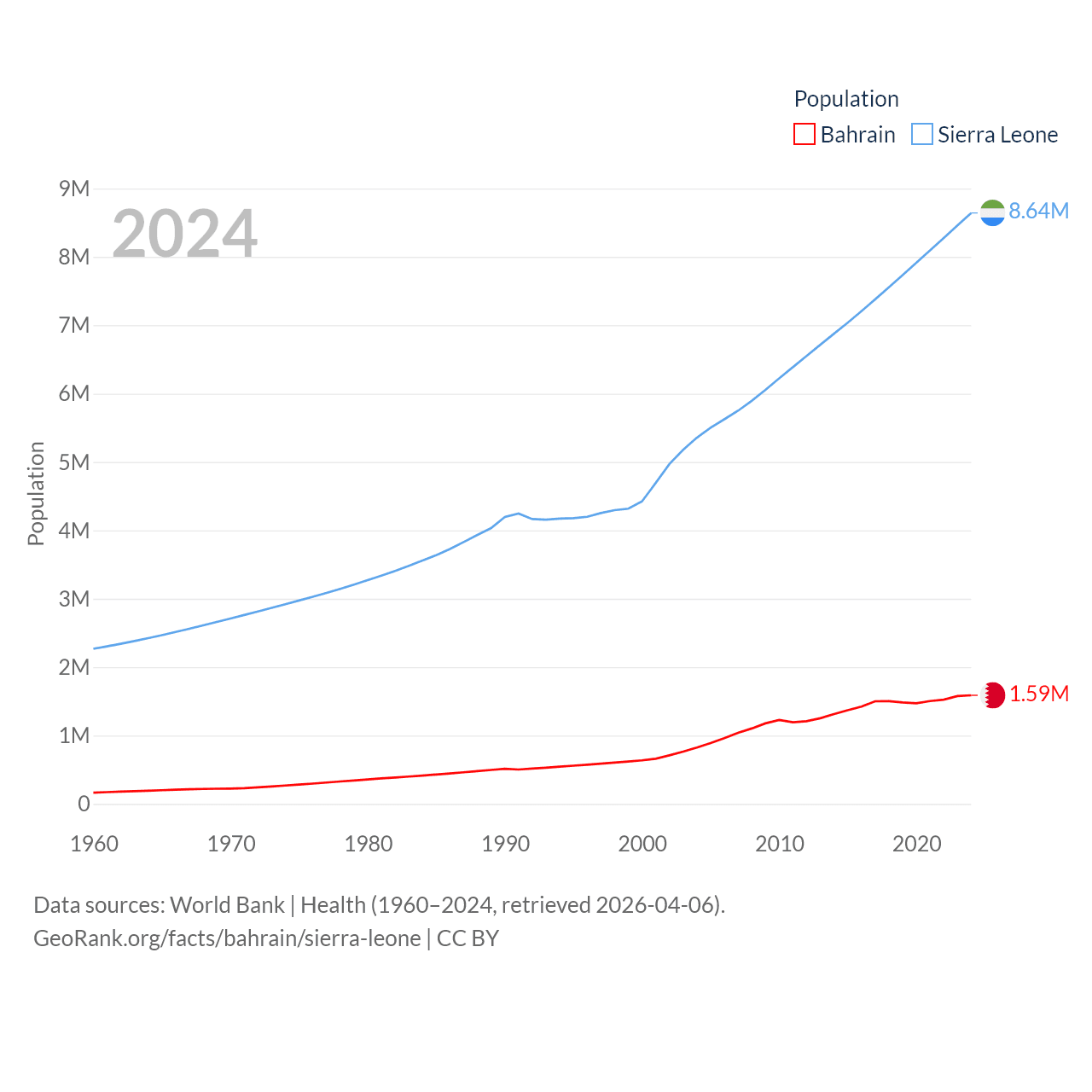 Bahrain has a population of 1.59M (ranked 151/197), compared with 8.64M in Sierra Leone (ranked 102/197). Bahrain's land area is 309 sq mi versus 27,869 sq mi for Sierra Leone (ranked 174th vs. 116th).
