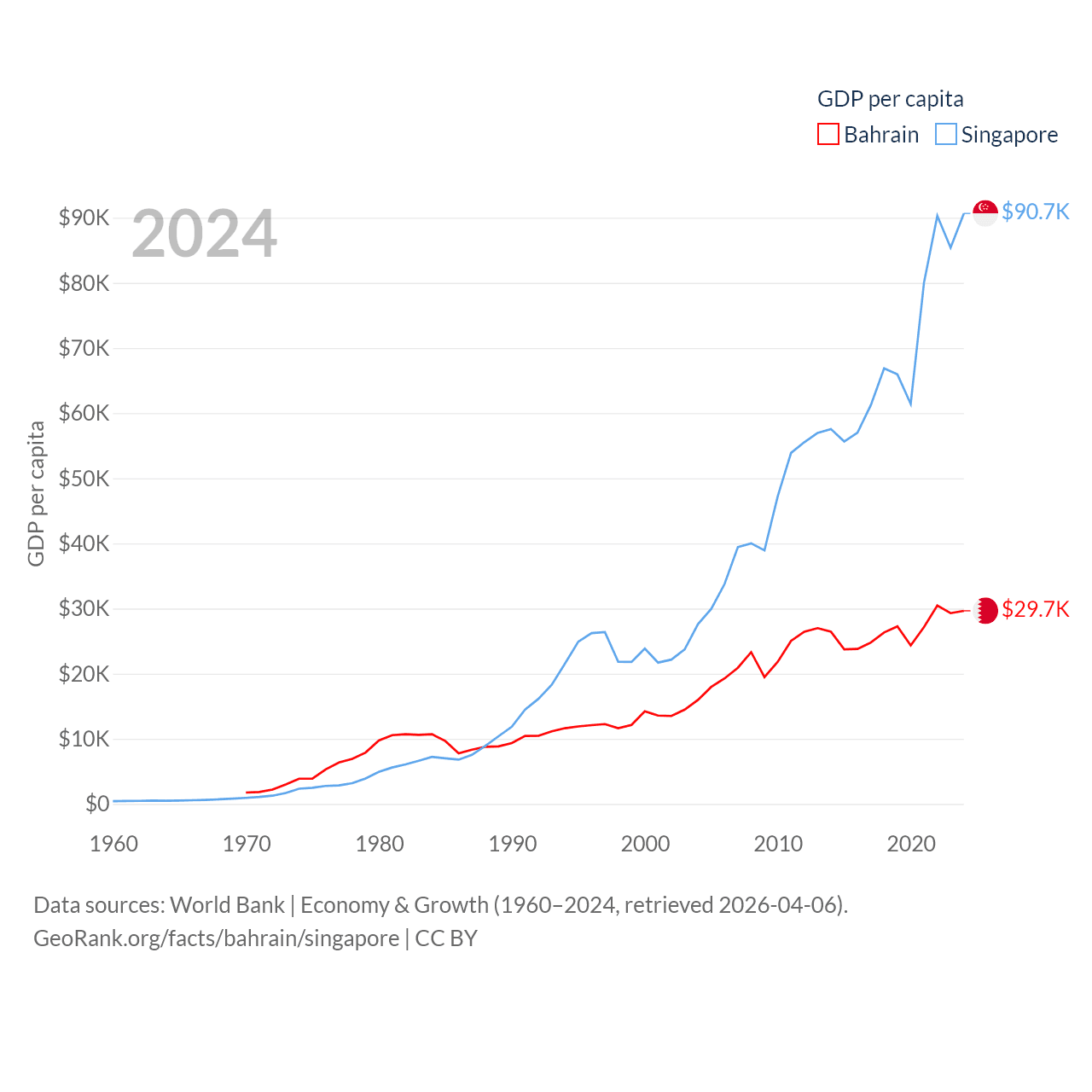 By GDP, Bahrain ranks 96/197 ($47.1B) and Singapore ranks 28/197 ($547B). By GDP per capita, Bahrain ranks 42/197 ($29,654), while Singapore ranks 7/197 ($90,674).