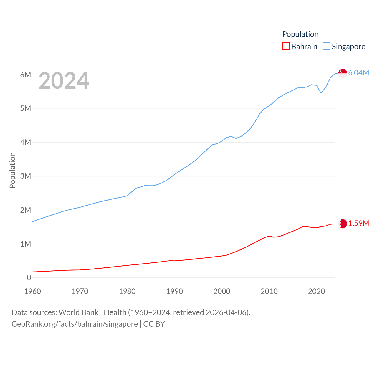 Bahrain has a population of 1.59M (ranked 151/197), compared with 6.04M in Singapore (ranked 113/197). Bahrain's land area is 309 sq mi versus 277.2 sq mi for Singapore (ranked 174th vs. 177th).