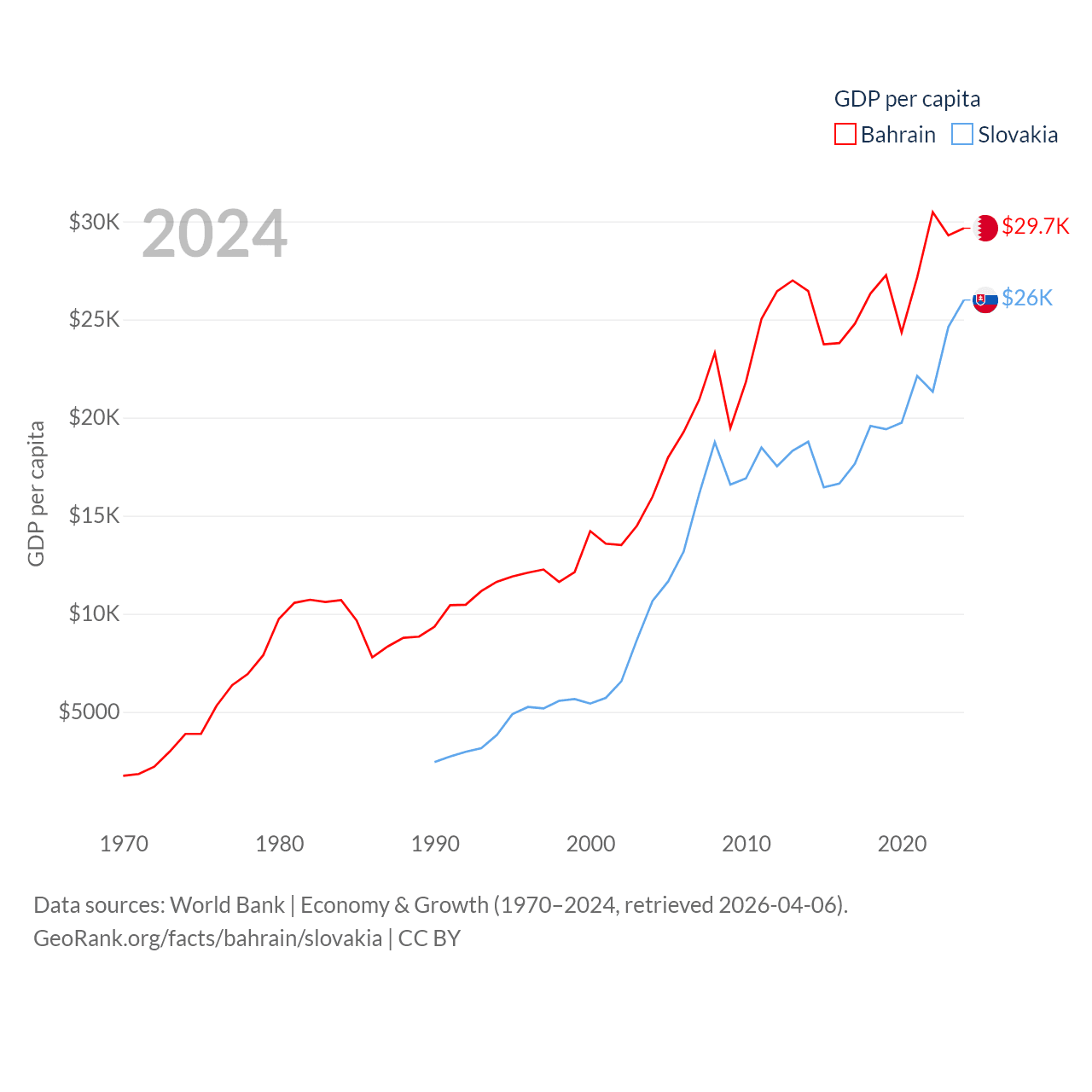 By GDP, Bahrain ranks 96/197 ($47.1B) and Slovakia ranks 61/197 ($141B). By GDP per capita, Bahrain ranks 42/197 ($29,654), while Slovakia ranks 47/197 ($25,993).