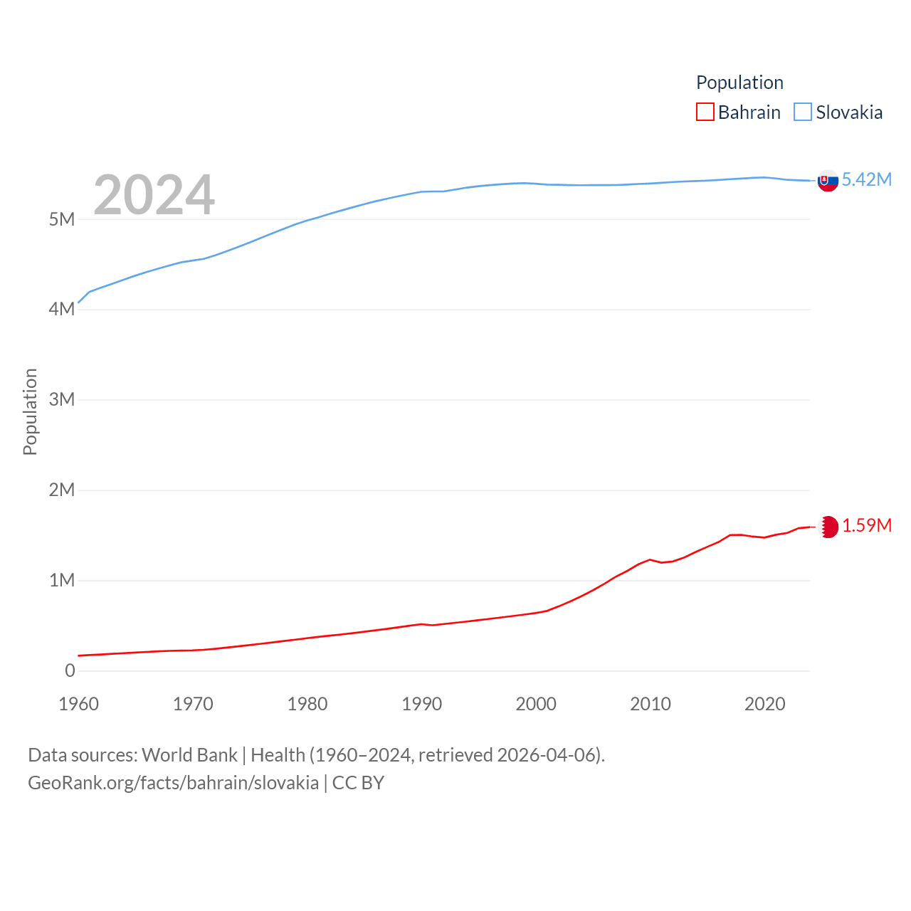 Bahrain has a population of 1.59M (ranked 151/197), compared with 5.42M in Slovakia (ranked 119/197). Bahrain's land area is 309 sq mi versus 18,564 sq mi for Slovakia (ranked 174th vs. 128th).
