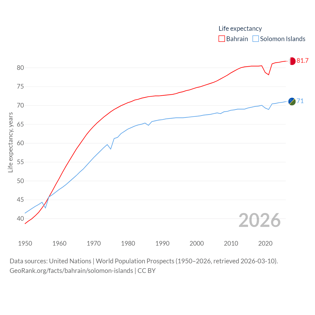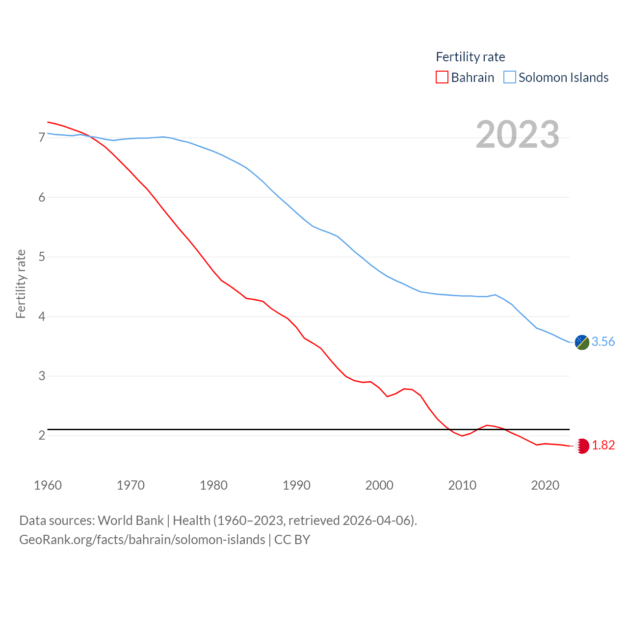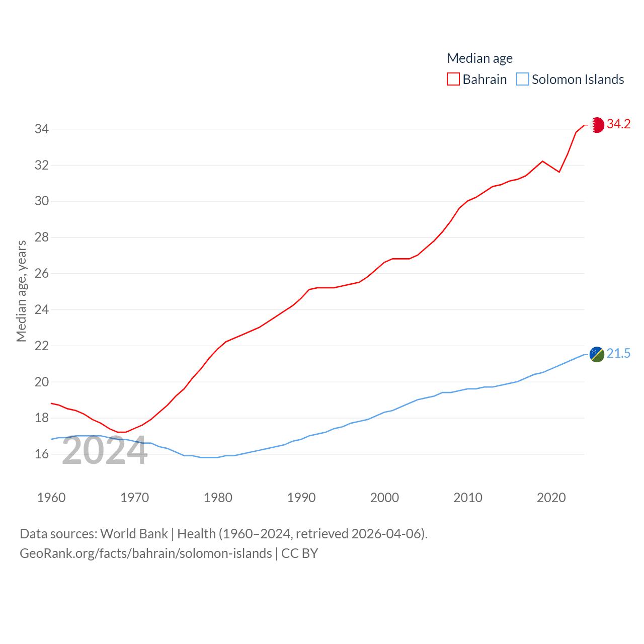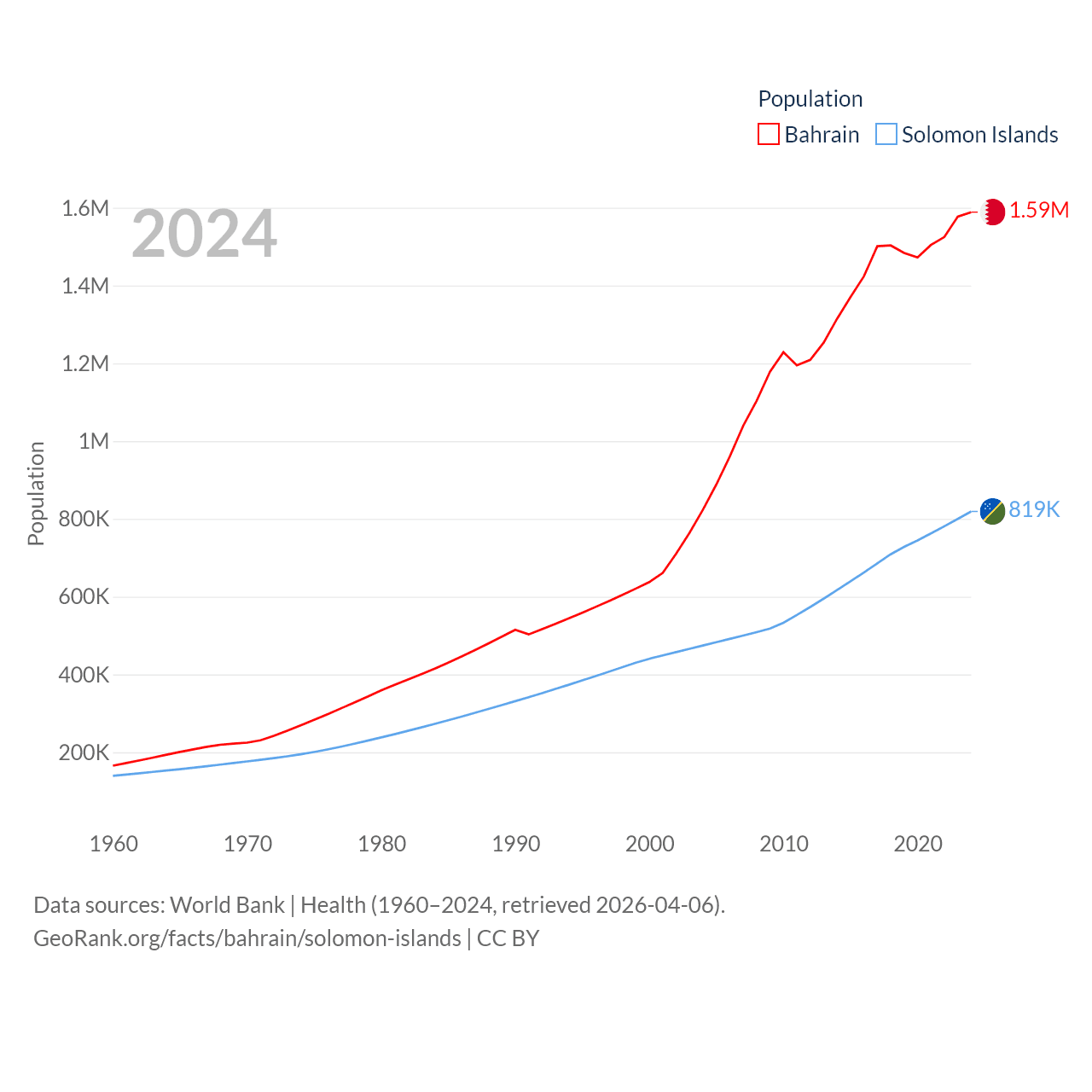 Bahrain has a population of 1.59M (ranked 151/197), compared with 819K in The Solomon Islands (ranked 162/197). Bahrain's land area is 309 sq mi versus 10,807 sq mi for The Solomon Islands (ranked 174th vs. 141st).