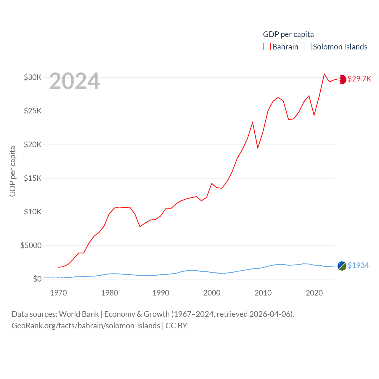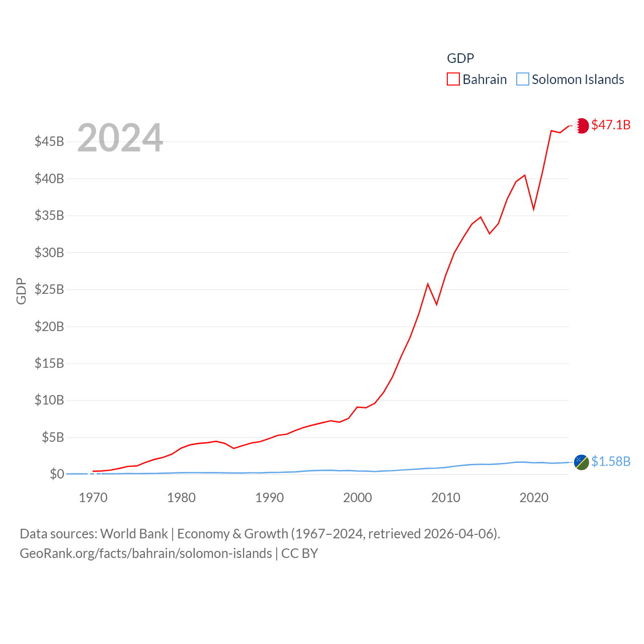 By GDP, Bahrain ranks 96/197 ($47.1B) and The Solomon Islands ranks 182/197 ($1.58B). By GDP per capita, Bahrain ranks 42/197 ($29,654), while The Solomon Islands ranks 157/197 ($1,934).