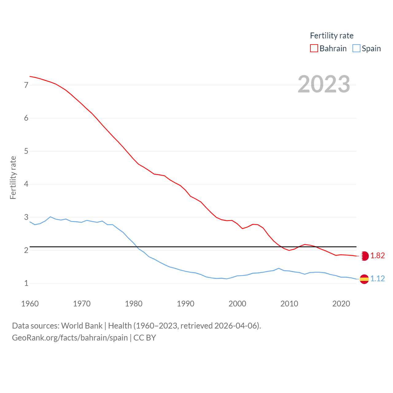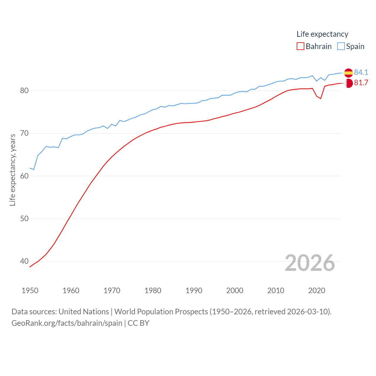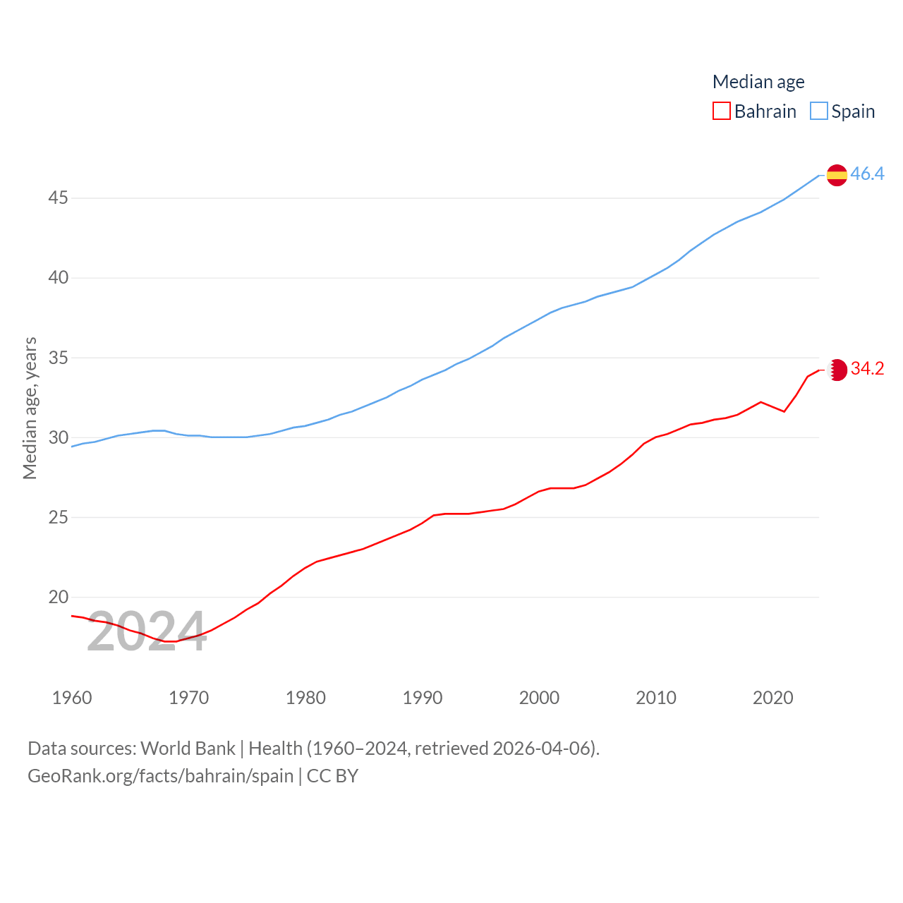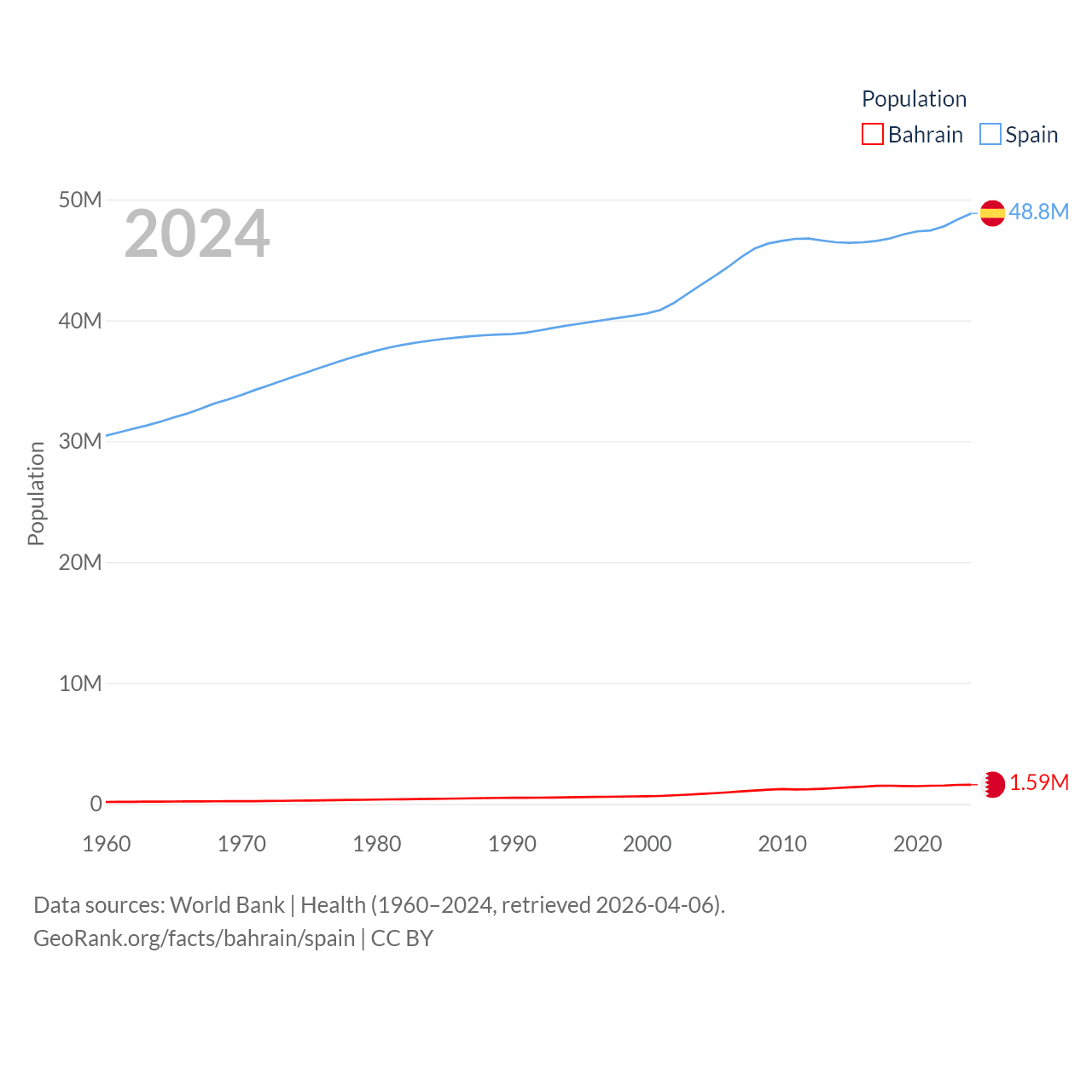 Bahrain has a population of 1.59M (ranked 151/197), compared with 48.8M in Spain (ranked 32/197). Bahrain's land area is 309 sq mi versus 192,934 sq mi for Spain (ranked 174th vs. 51st).