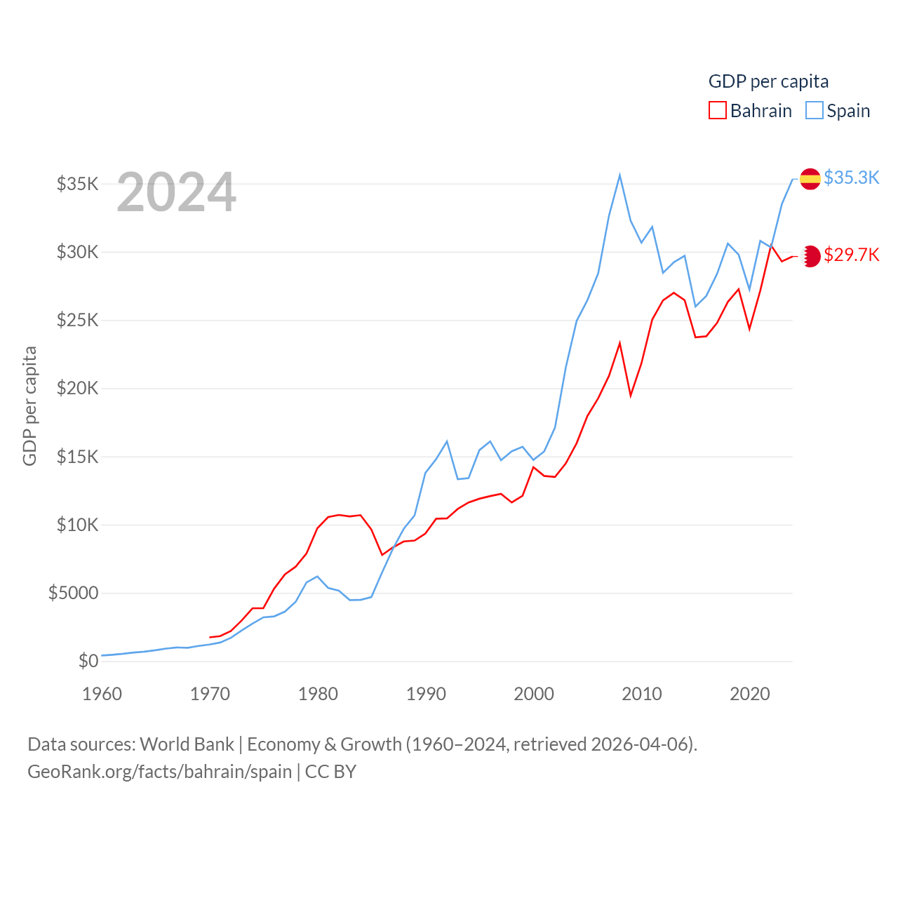 By GDP, Bahrain ranks 96/197 ($47.1B) and Spain ranks 15/197 ($1.73T). By GDP per capita, Bahrain ranks 42/197 ($29,654), while Spain ranks 32/197 ($35,327).