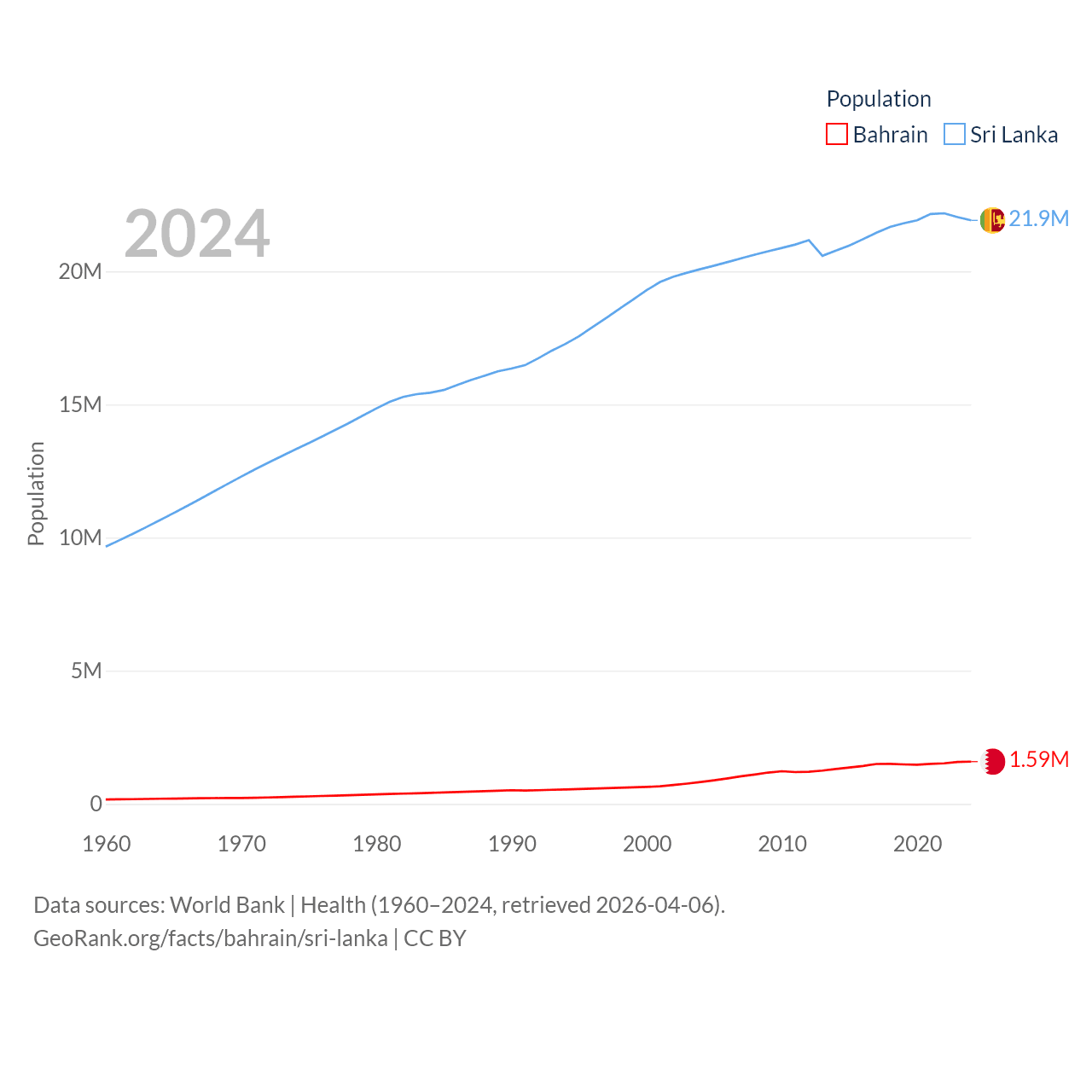 Bahrain has a population of 1.59M (ranked 151/197), compared with 21.9M in Sri Lanka (ranked 61/197). Bahrain's land area is 309 sq mi versus 23,884 sq mi for Sri Lanka (ranked 174th vs. 122nd).