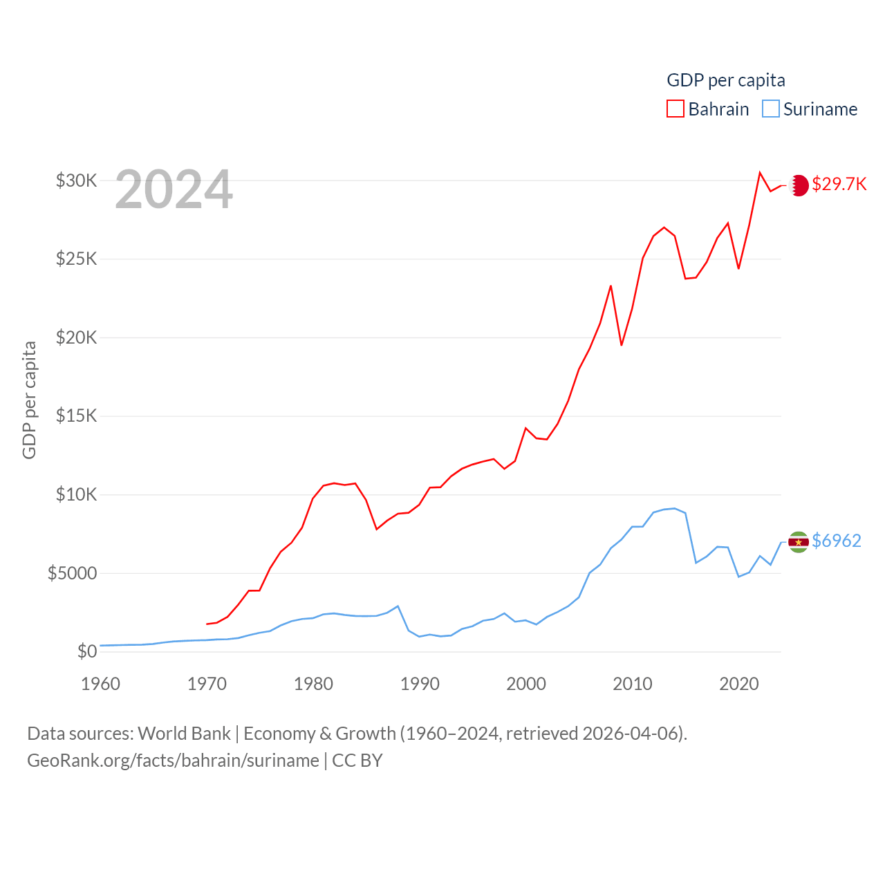By GDP, Bahrain ranks 96/197 ($47.1B) and Suriname ranks 164/197 ($4.42B). By GDP per capita, Bahrain ranks 42/197 ($29,654), while Suriname ranks 102/197 ($6,962).