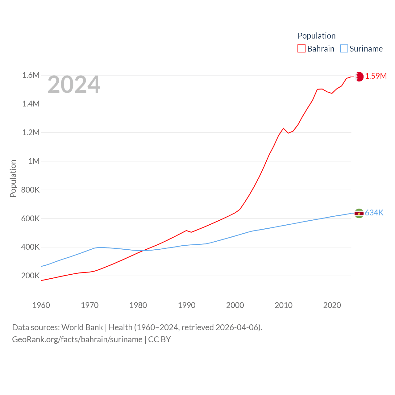 Bahrain has a population of 1.59M (ranked 151/197), compared with 634K in Suriname (ranked 165/197). Bahrain's land area is 309 sq mi versus 61,972 sq mi for Suriname (ranked 174th vs. 90th).