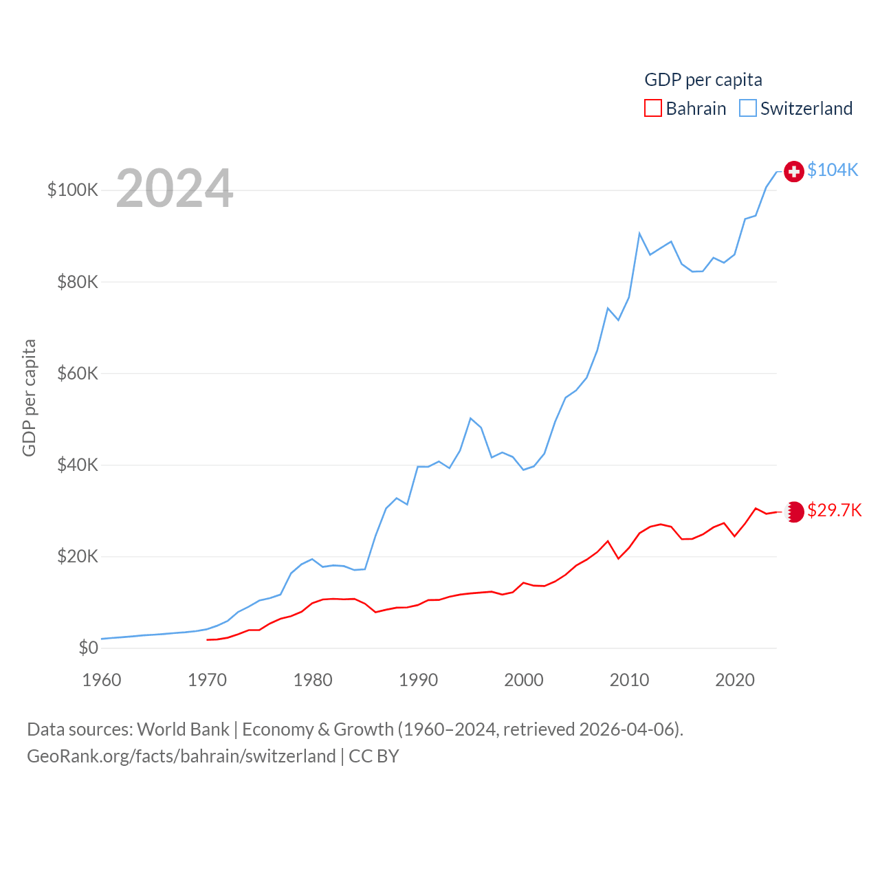 By GDP, Bahrain ranks 96/197 ($47.1B) and Switzerland ranks 20/197 ($937B). By GDP per capita, Bahrain ranks 42/197 ($29,654), while Switzerland ranks 5/197 ($103,998).