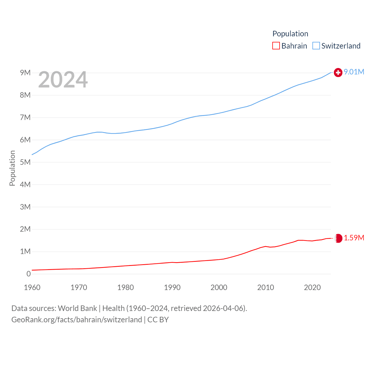 Bahrain has a population of 1.59M (ranked 151/197), compared with 9.01M in Switzerland (ranked 101/197). Bahrain's land area is 309 sq mi versus 15,255 sq mi for Switzerland (ranked 174th vs. 131st).