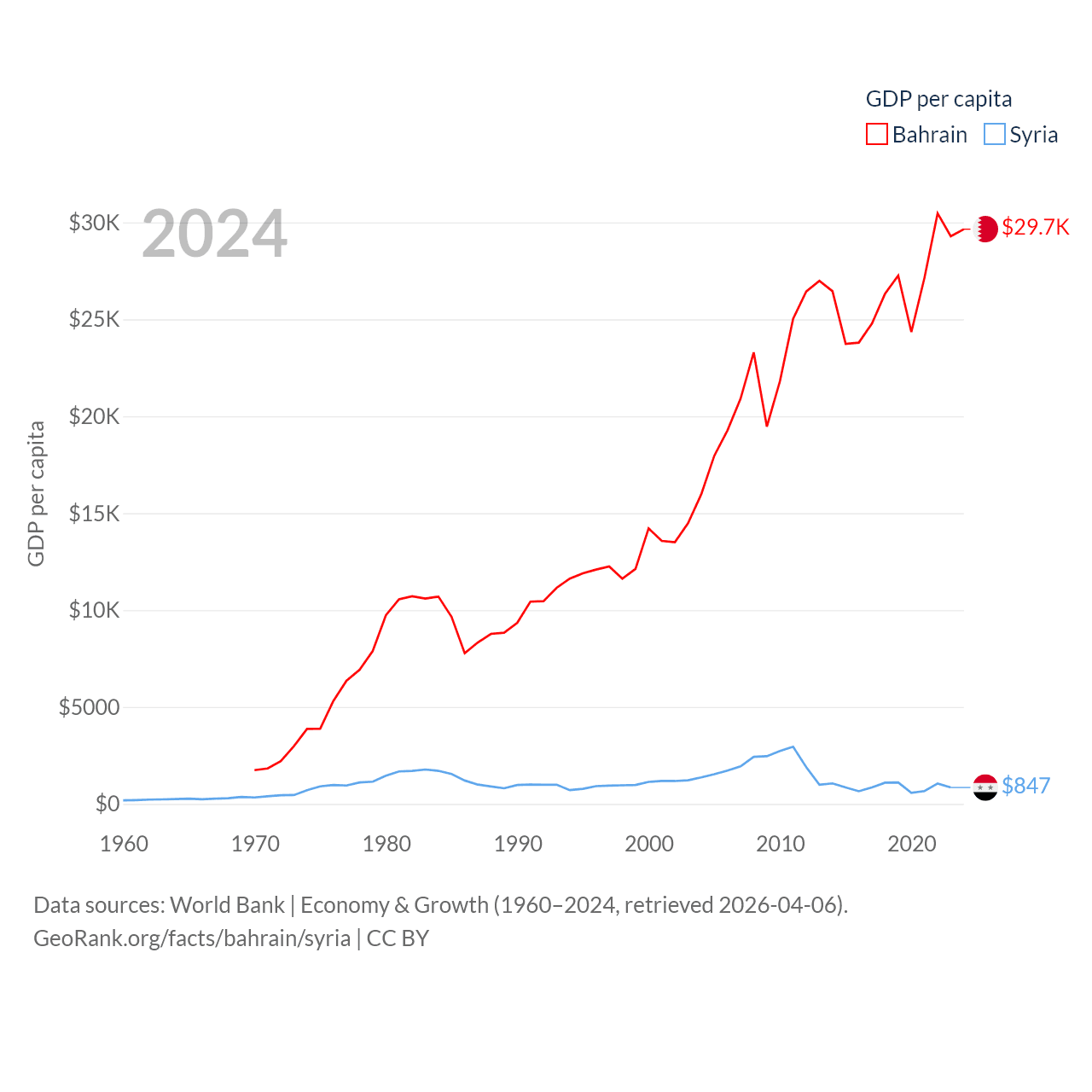 By GDP, Bahrain ranks 96/197 ($47.1B) and Syria ranks 129/197 ($20B). By GDP per capita, Bahrain ranks 42/197 ($29,654), while Syria ranks 185/197 ($847).